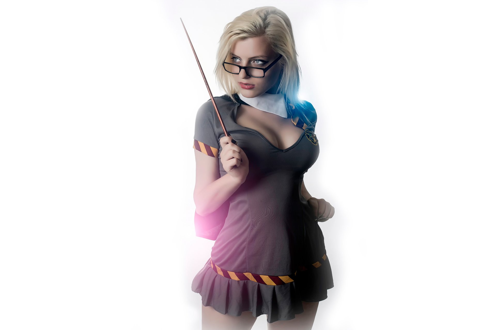Bionda con gli occhiali con un puntatore posa in Insegnante