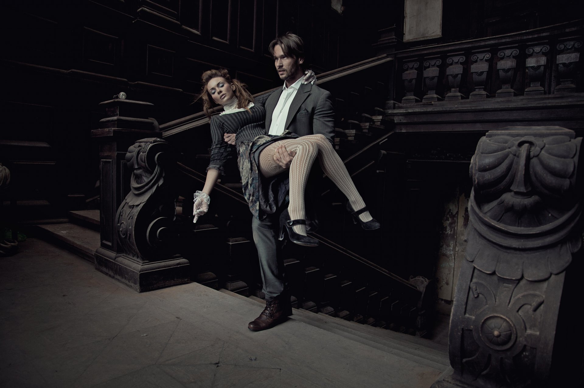 Ragazza in un lungo abito bianco accanto al ragazzo nella finestra