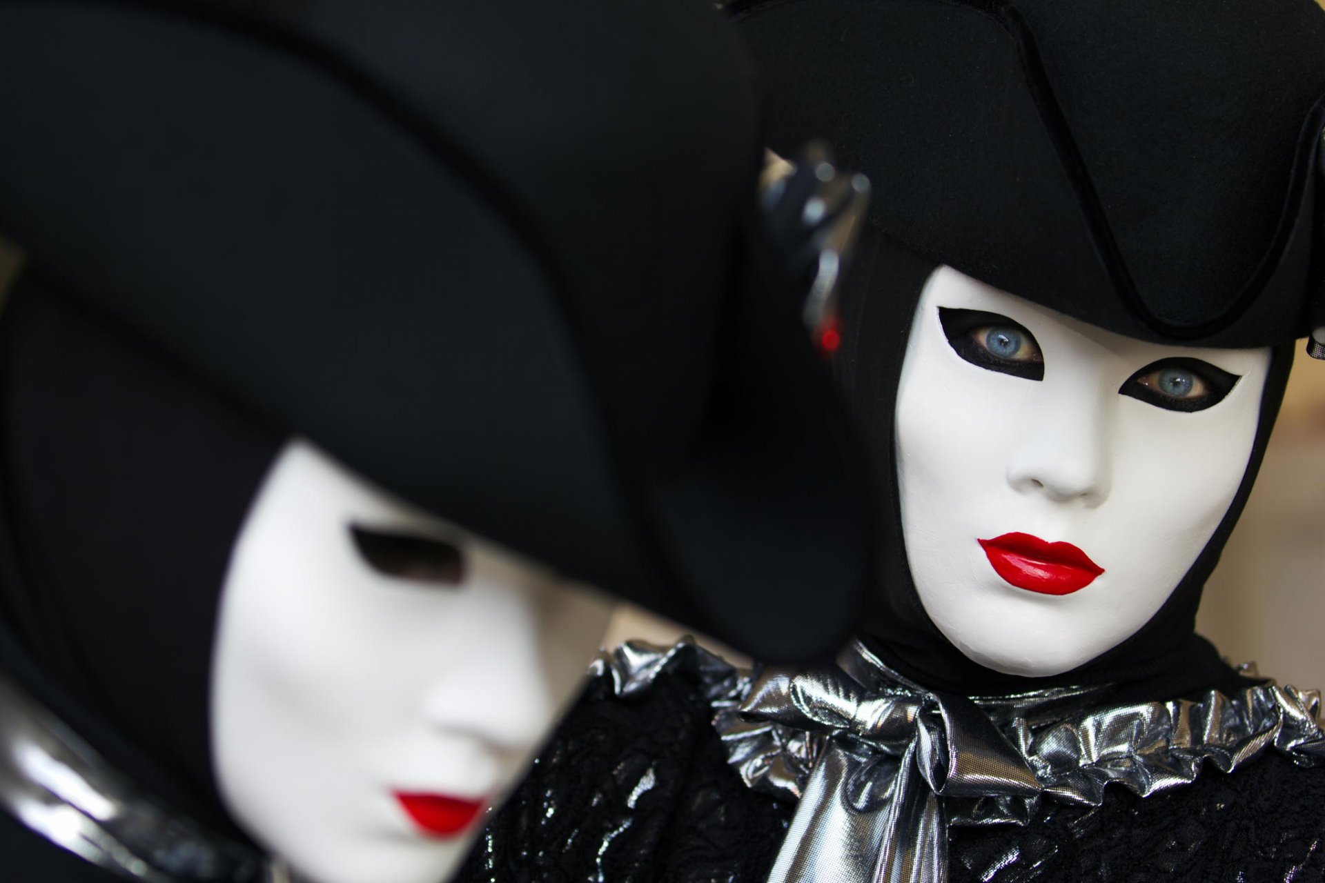 Un look da carnevale con una maschera pallida, occhi e labbra luminosi