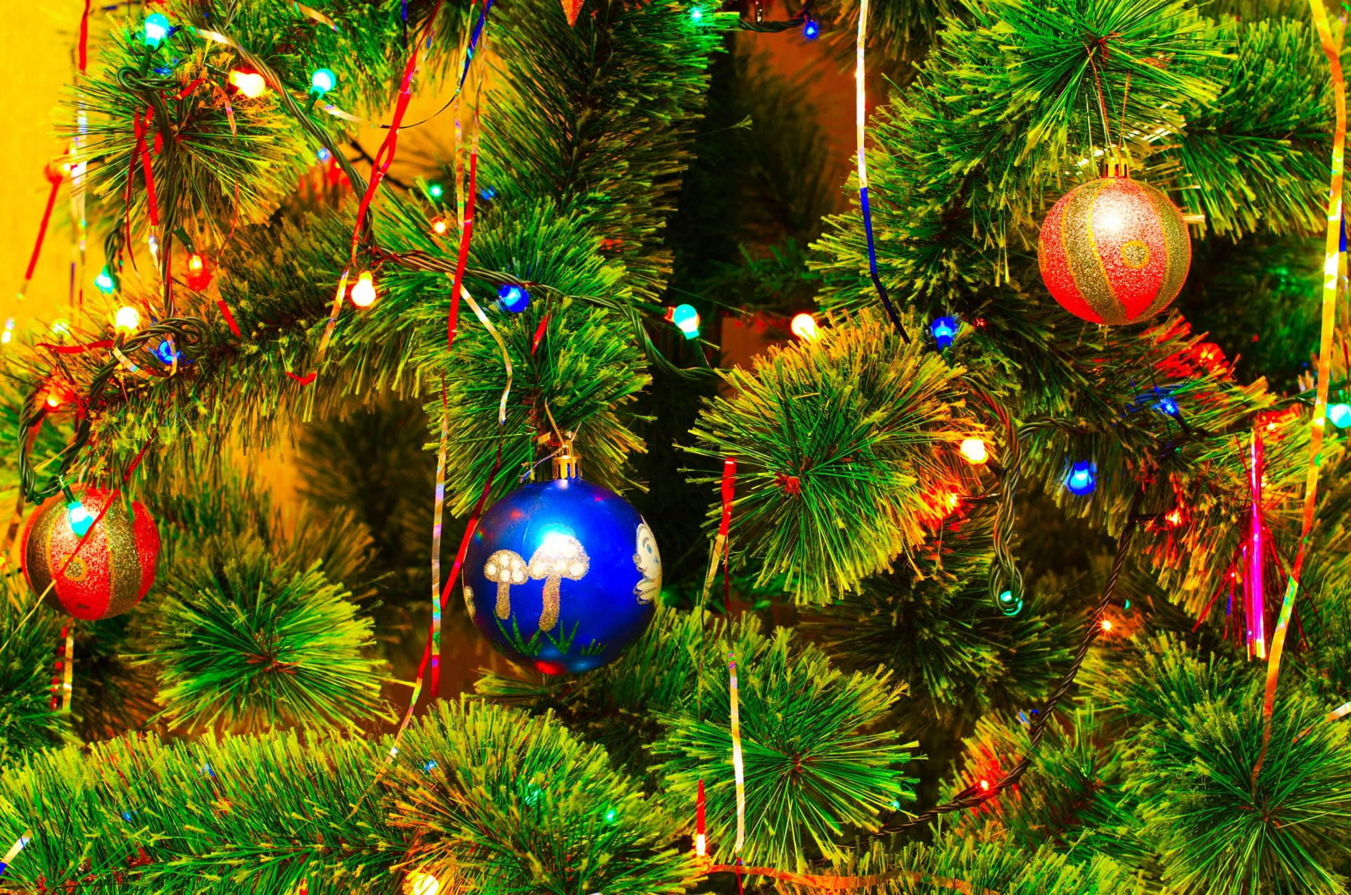 Decorazione dell'albero di Natale su un ramo in luci scintillanti
