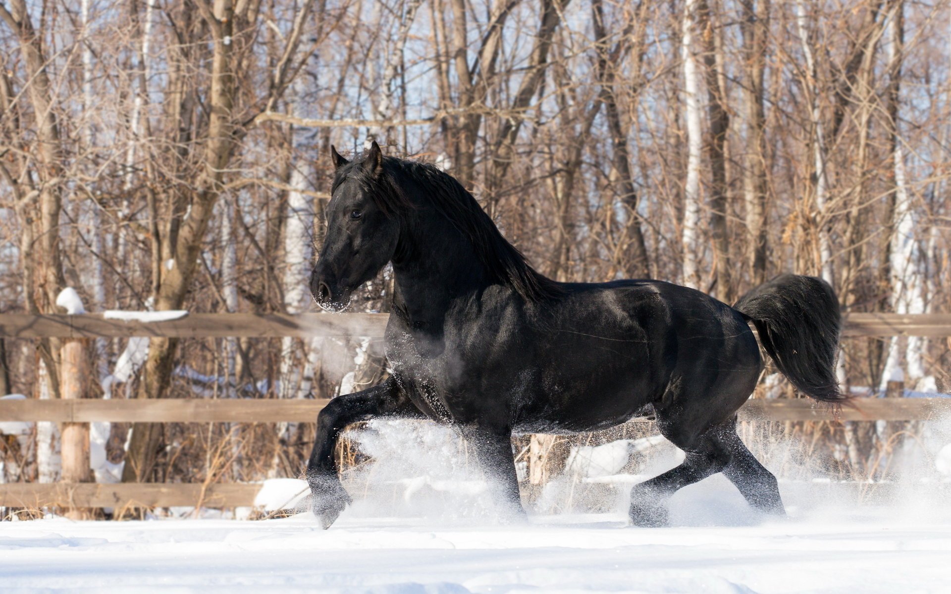 Cavallo nero che corre sulla neve
