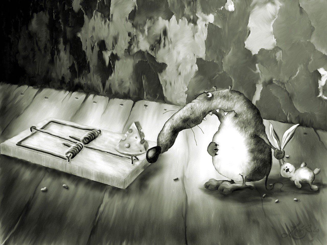 Il topo guarda con rimpianto il formaggio nella trappola per topi