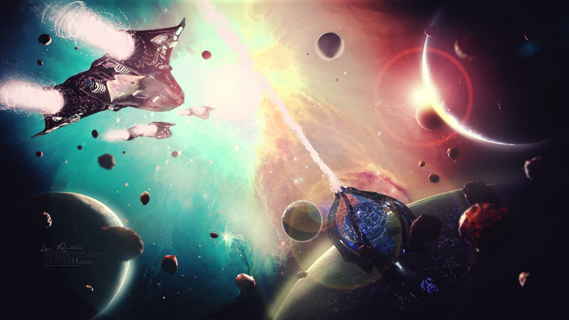 Arte atmosferica con pianeti e astronavi