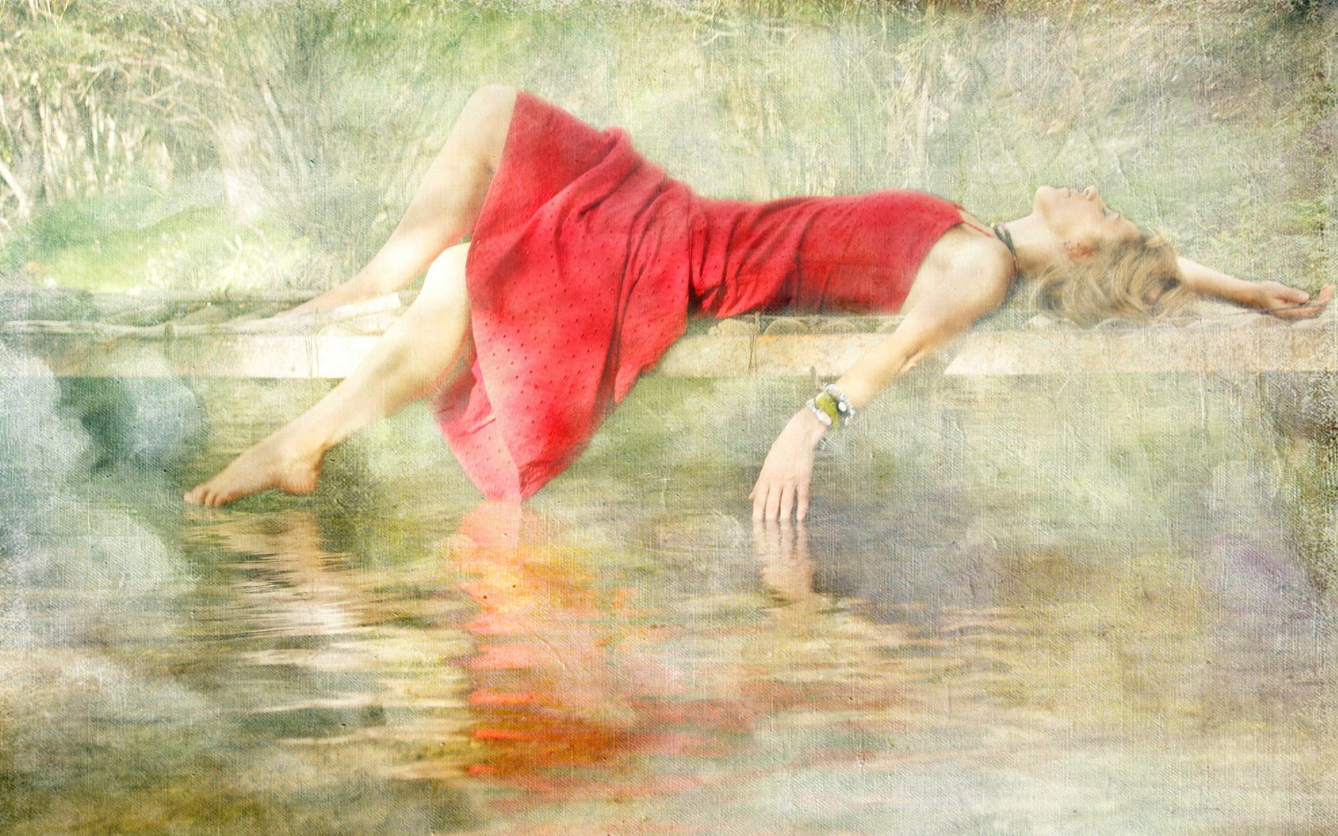 Ragazza in piedi fino alla vita in acqua sullo sfondo del tramonto