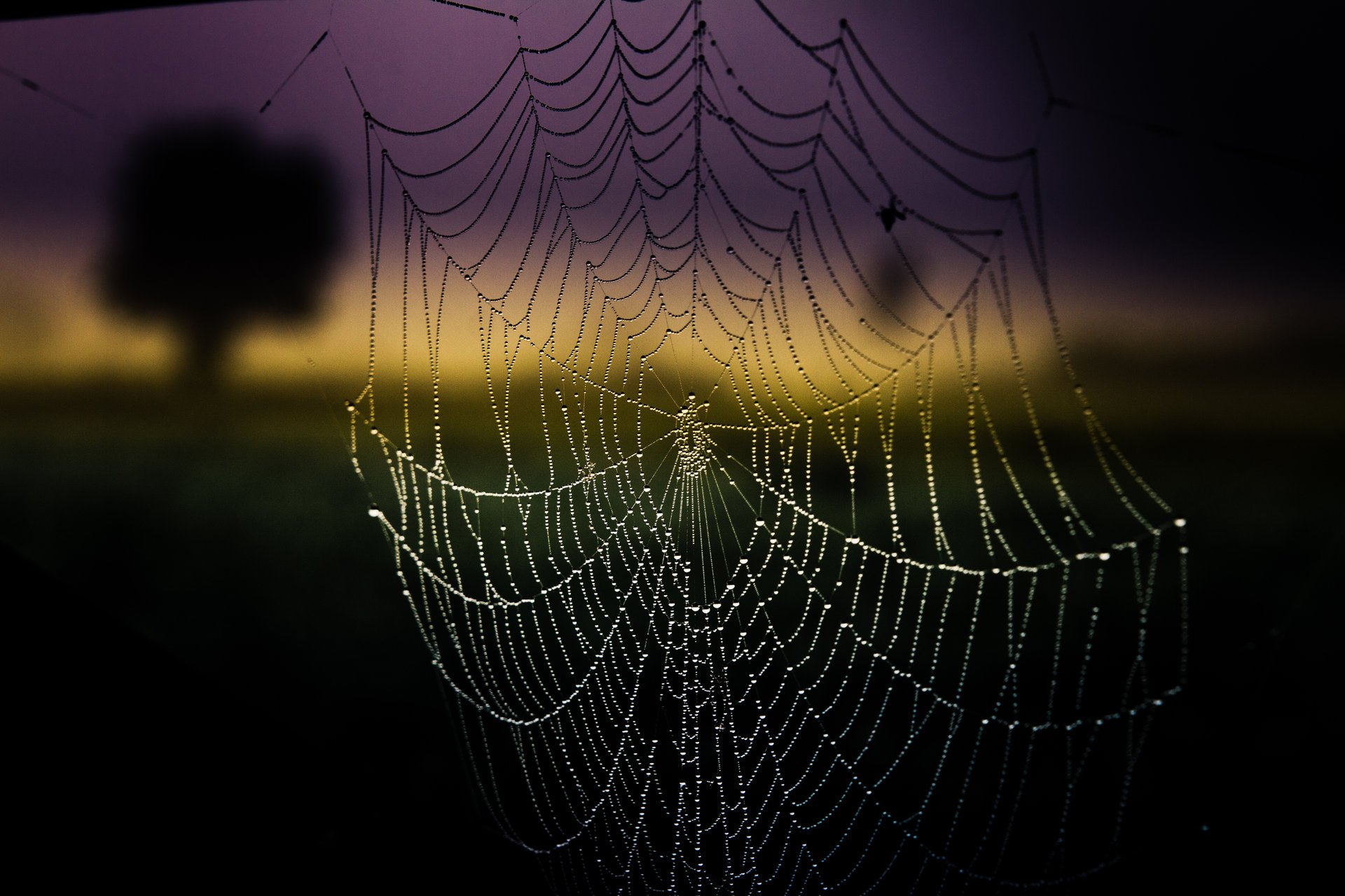 Gocce di rugiada su una ragnatela su uno sfondo di verde