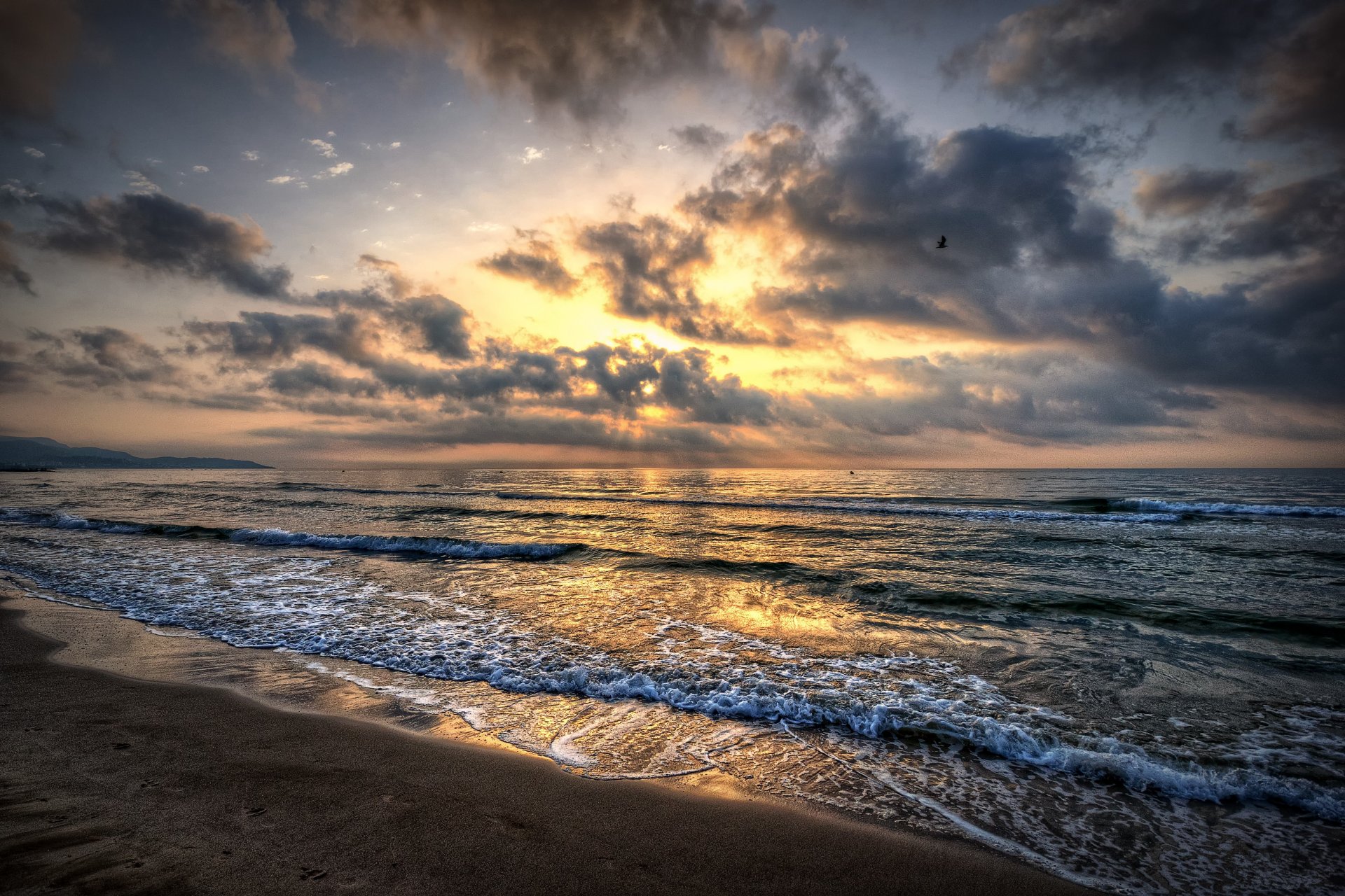 Mare con onde e sabbia durante il tramonto