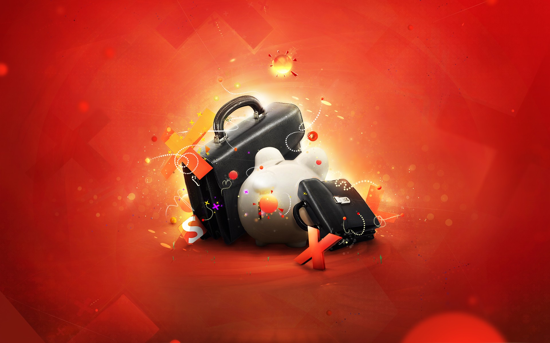 Portafogli neri e salvadanaio bianco su sfondo rosso