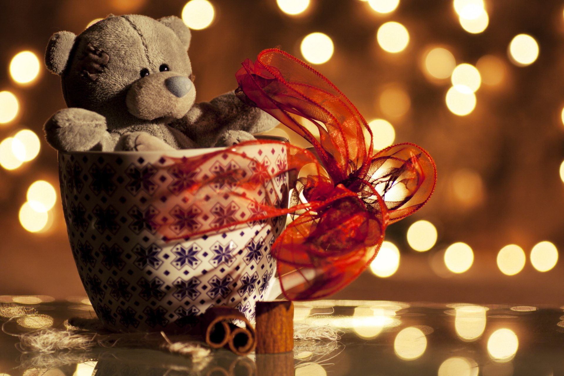 Orsacchiotto confezionato in vaso con nastro regalo rosso