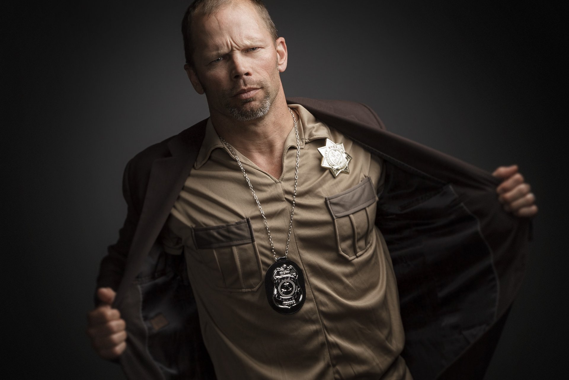 Uomo in uniforme della polizia su sfondo scuro