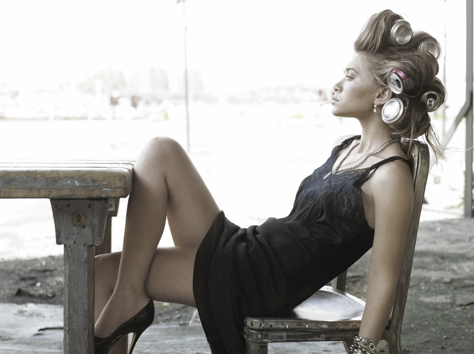 Elizabeth Olsen sulla sedia. Piede su piede. Tavolo vicino