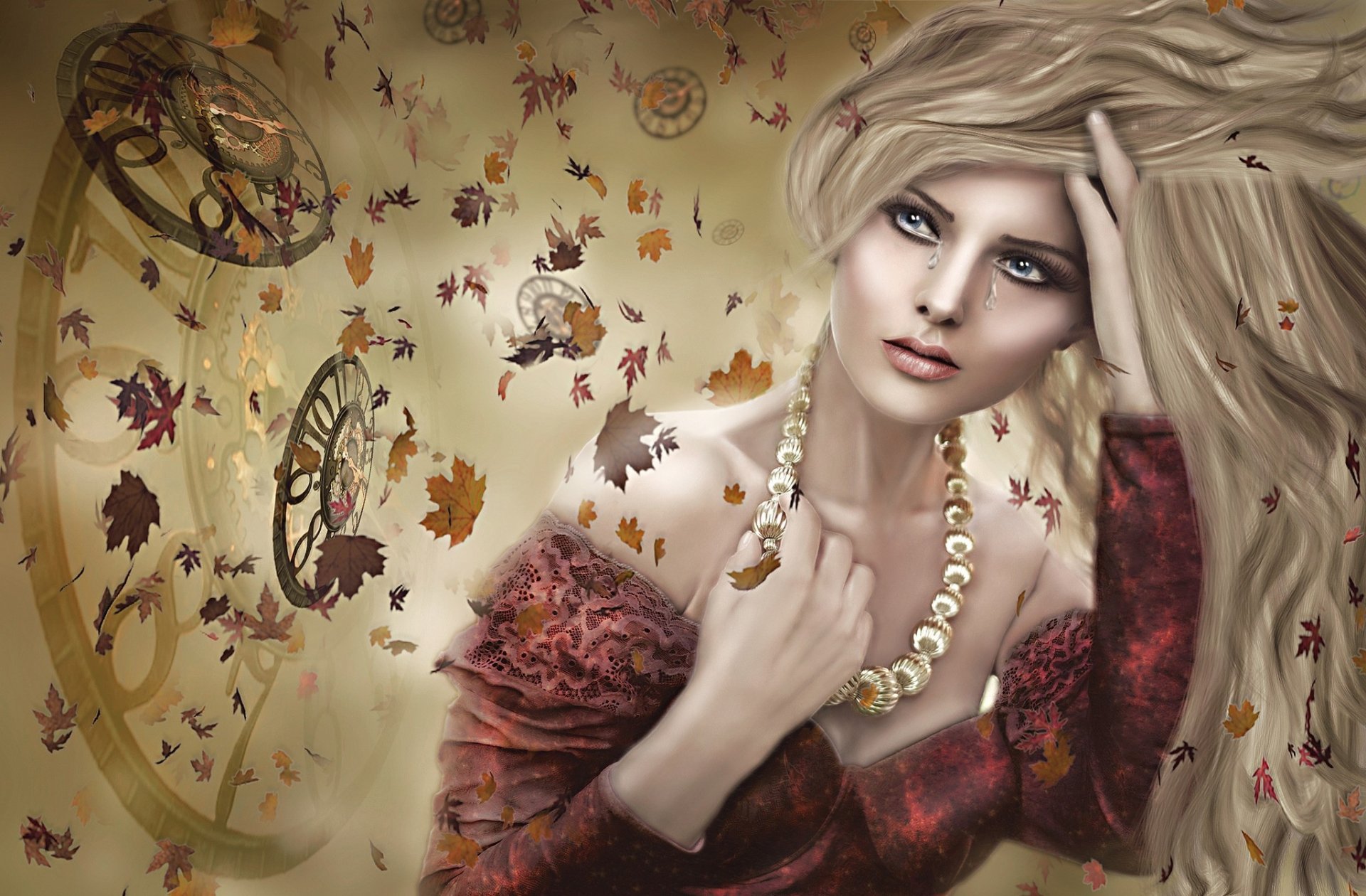 Ragazza bionda piangente sullo sfondo di orologi e foglie