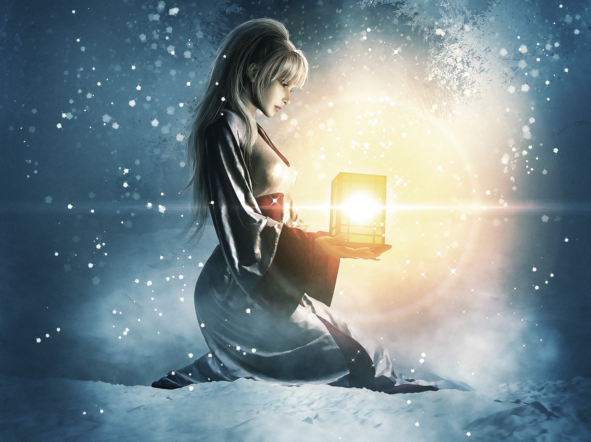 Una ragazza in kimono si siede sulla neve con una lanterna in mano