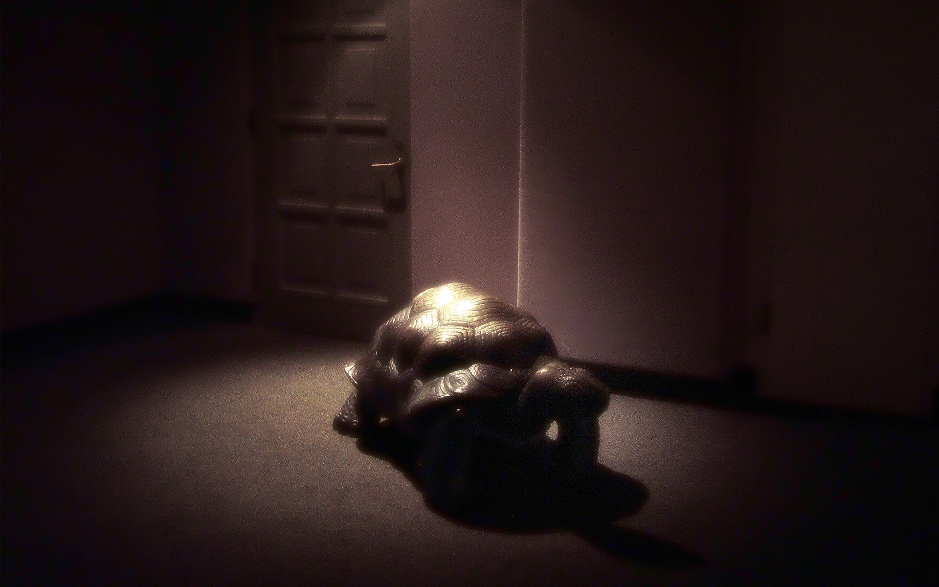 Tartaruga in una stanza buia sullo sfondo della porta