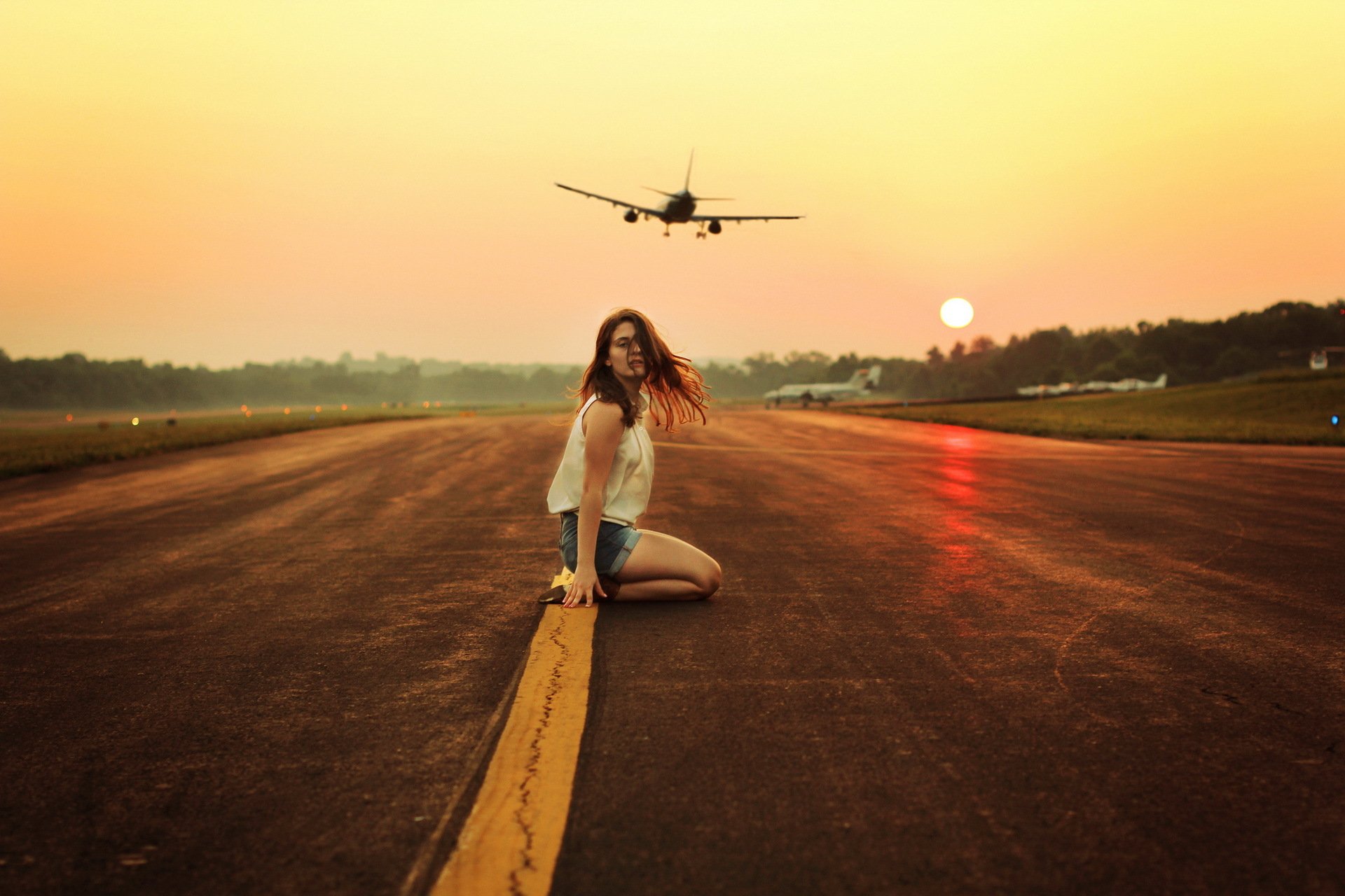 Ragazza bruna Slim si siede sulla strada