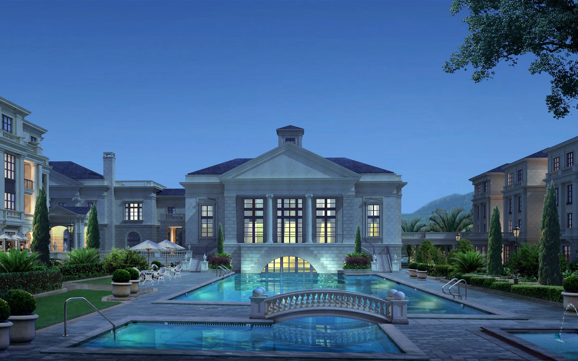 Casa elegante sul fiume con fontane, sotto il cielo serale