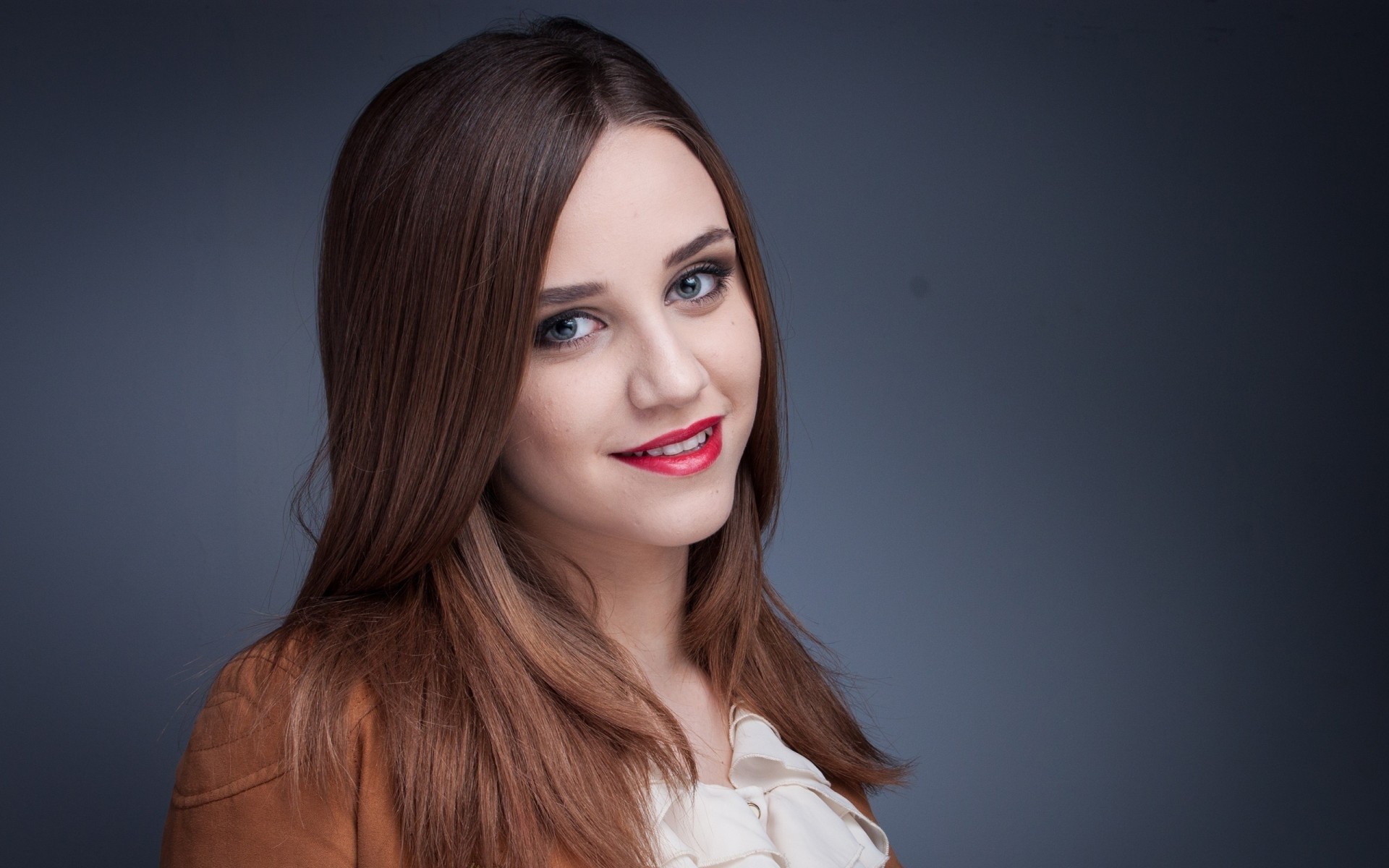 Ultra-cutie dai capelli neri con rossetto rosso sulle labbra sorride
