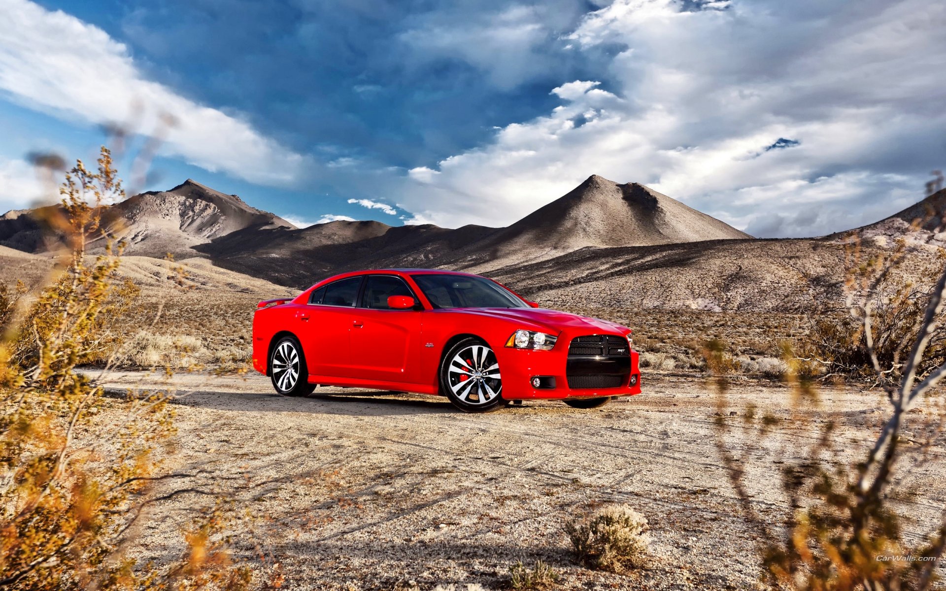 Auto rossa range rover sport sotto le nuvole nere del terreno di montagna