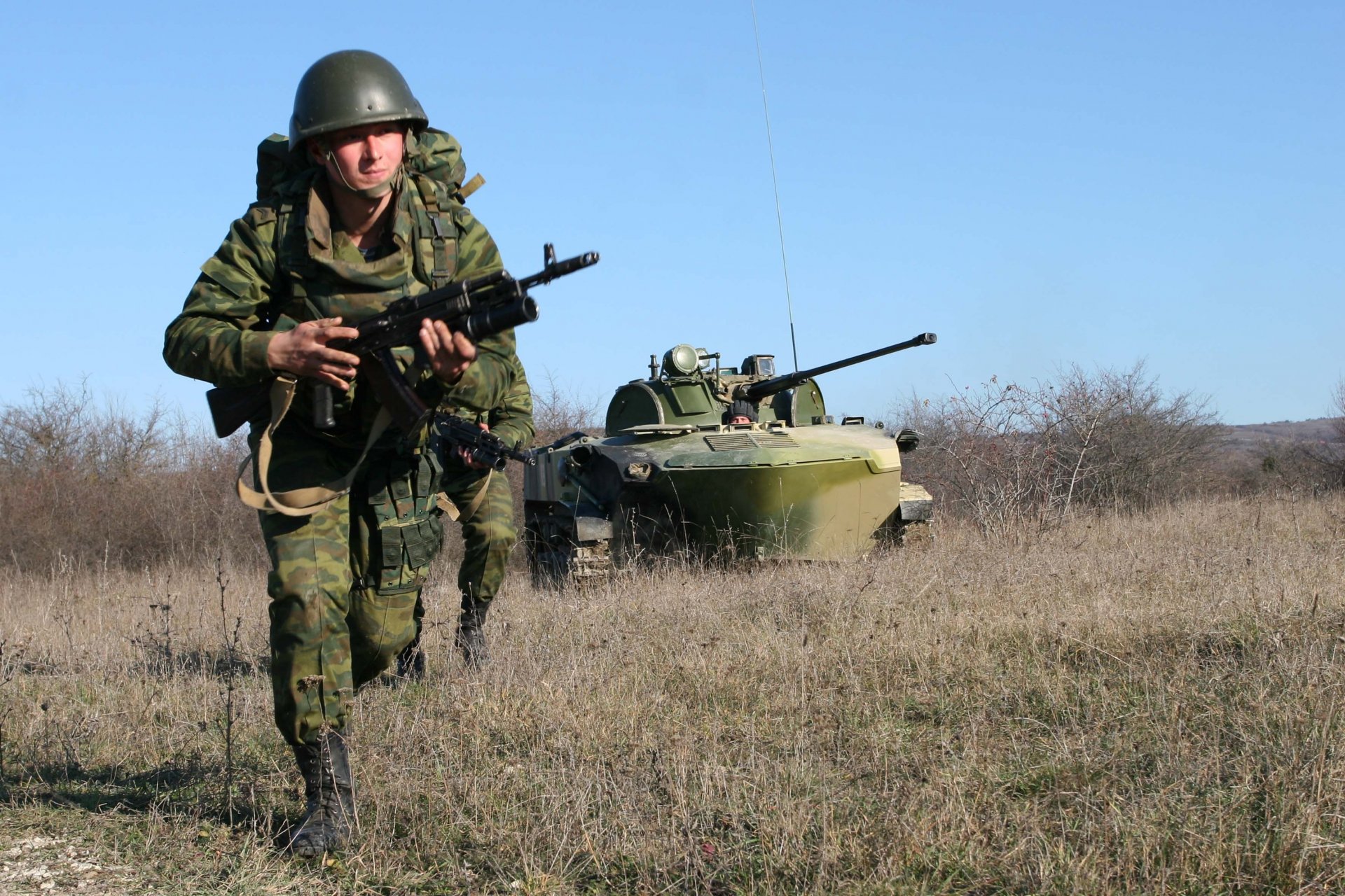 Militare con un fucile d'assalto corre sul campo