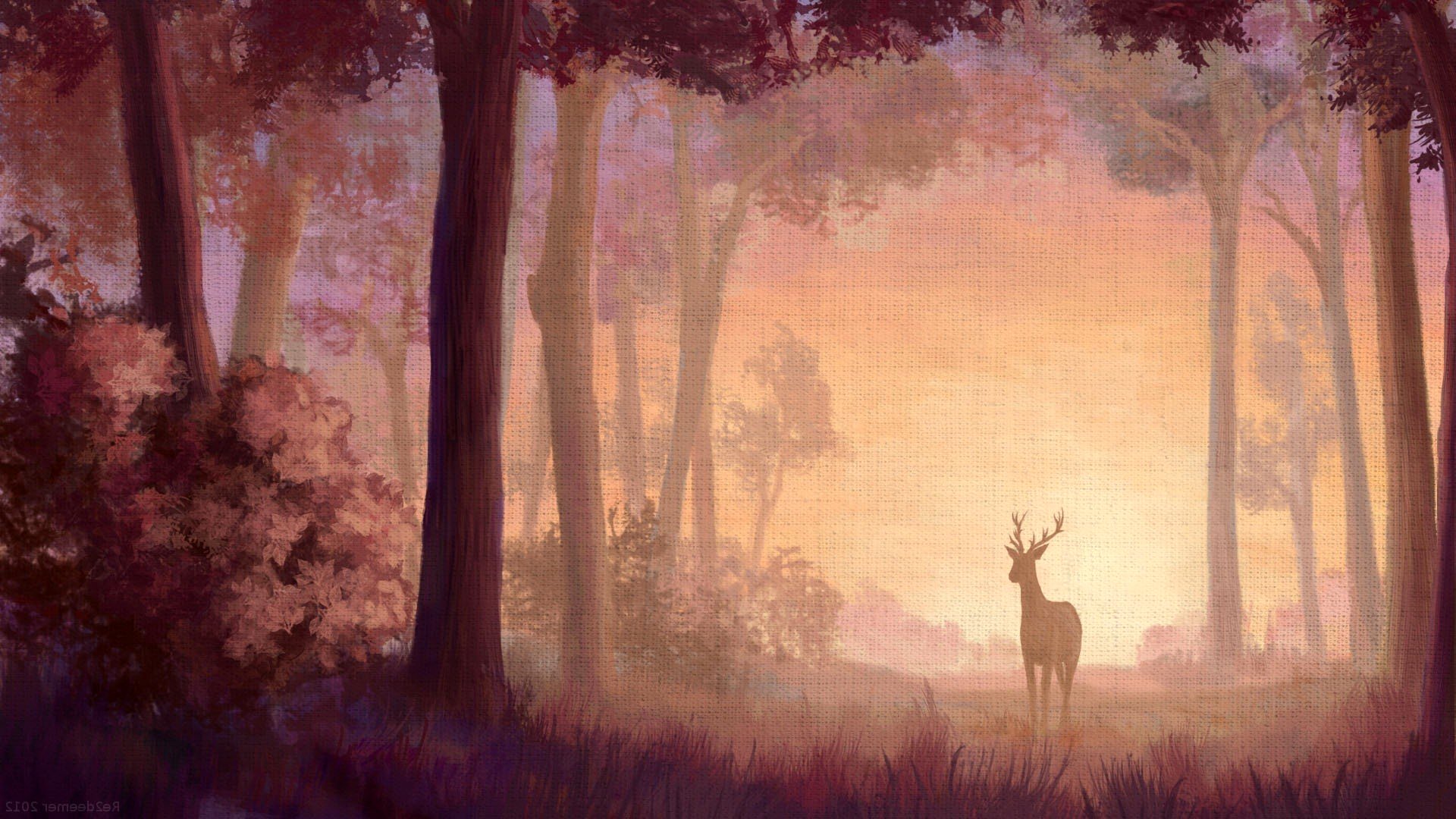 La tela ha sfumature molto delicate, bellissimi alberi e cervi