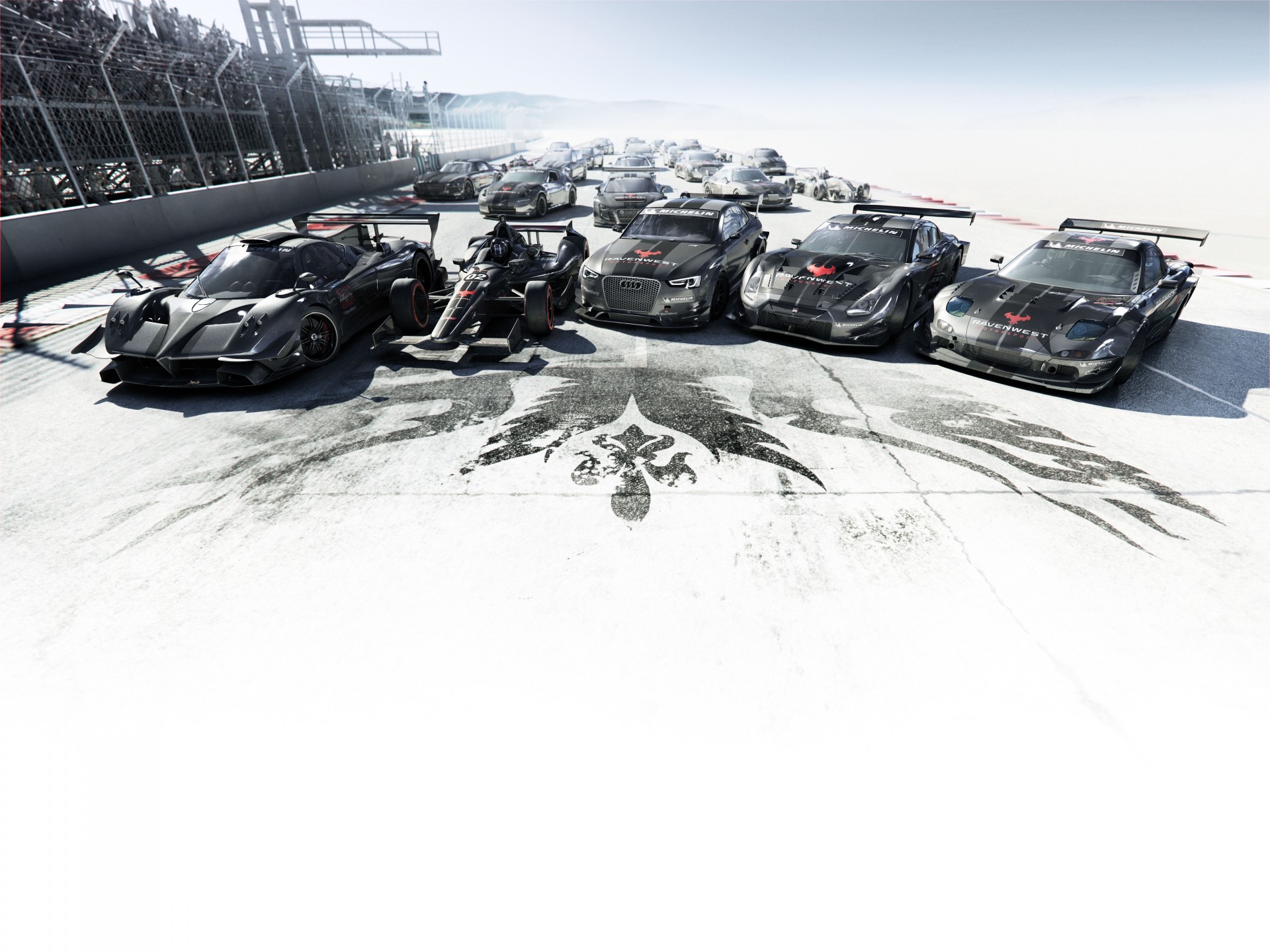 Macchine con motori ad alta velocità sullo sfondo dell'emblema dello Stato