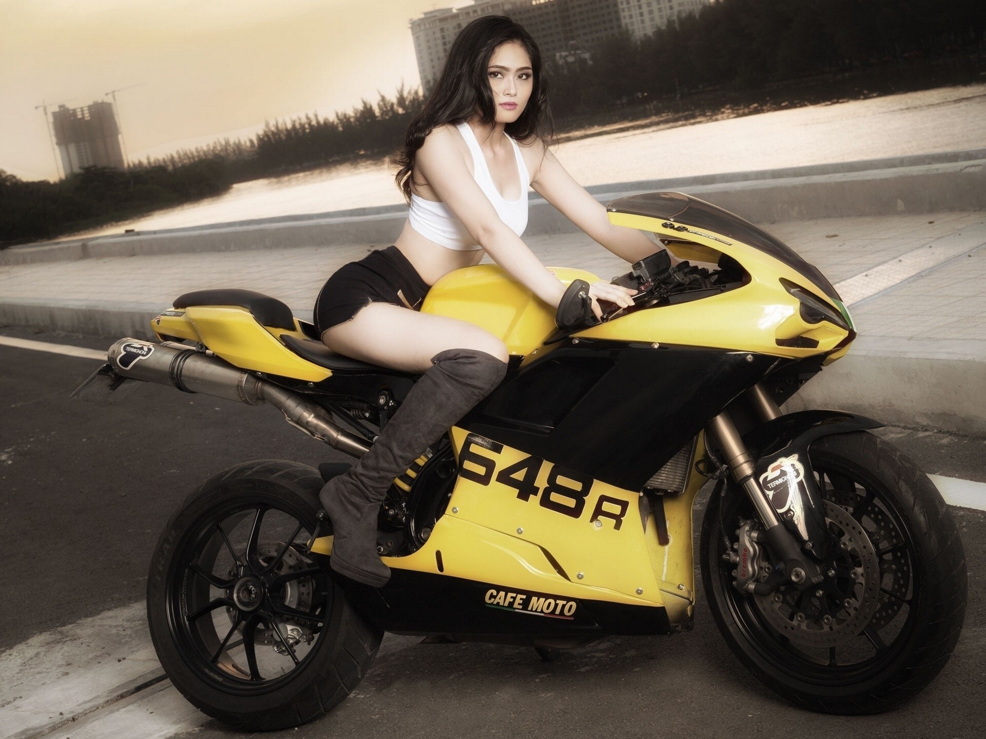 Ragazza asiatica con i capelli sciolti si siede su una moto