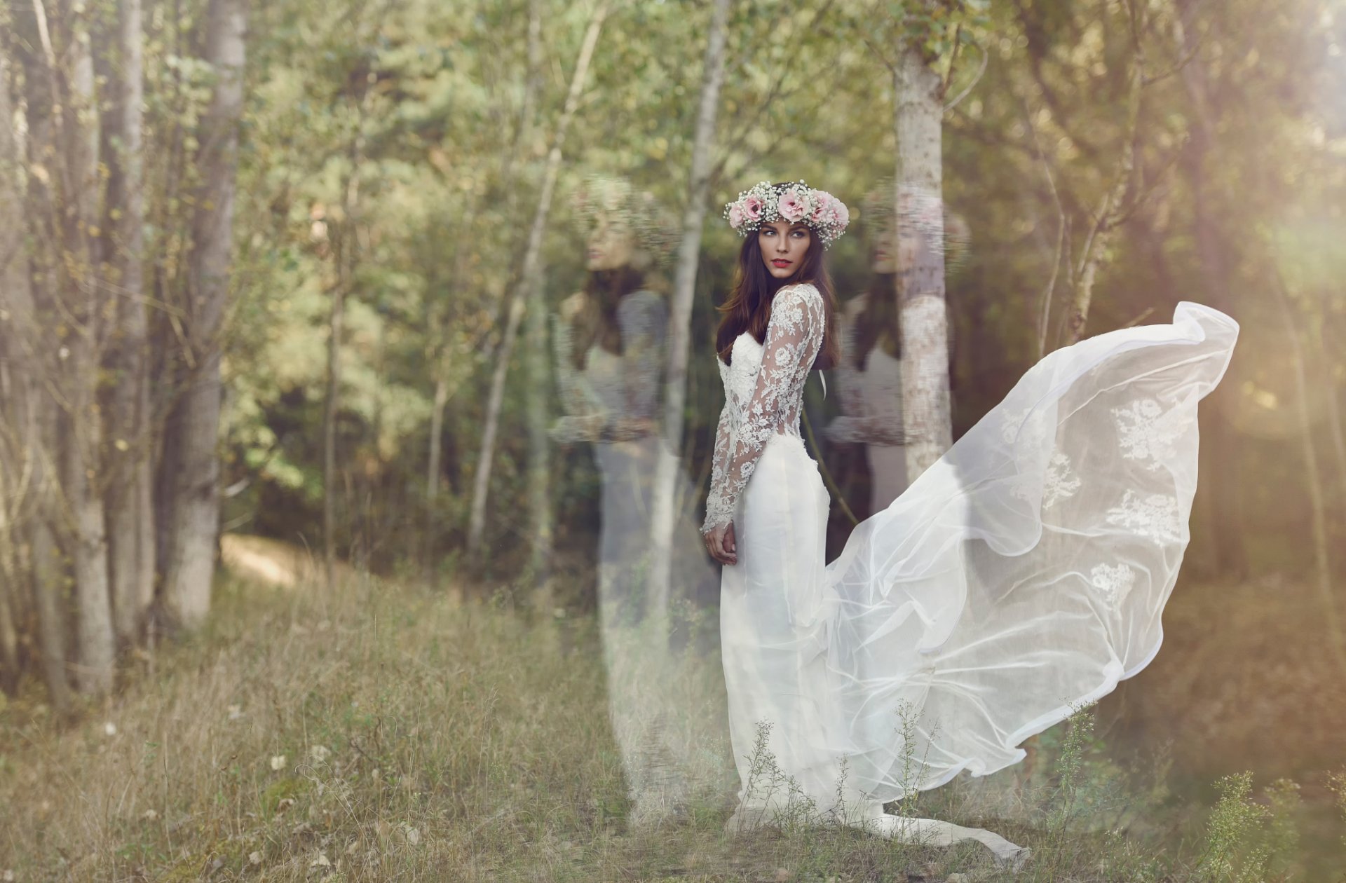 Catwoman con occhi bianchi torbidi in costume di Pavone tiene in mano una piccola lince in una collana verde sullo sfondo della natura