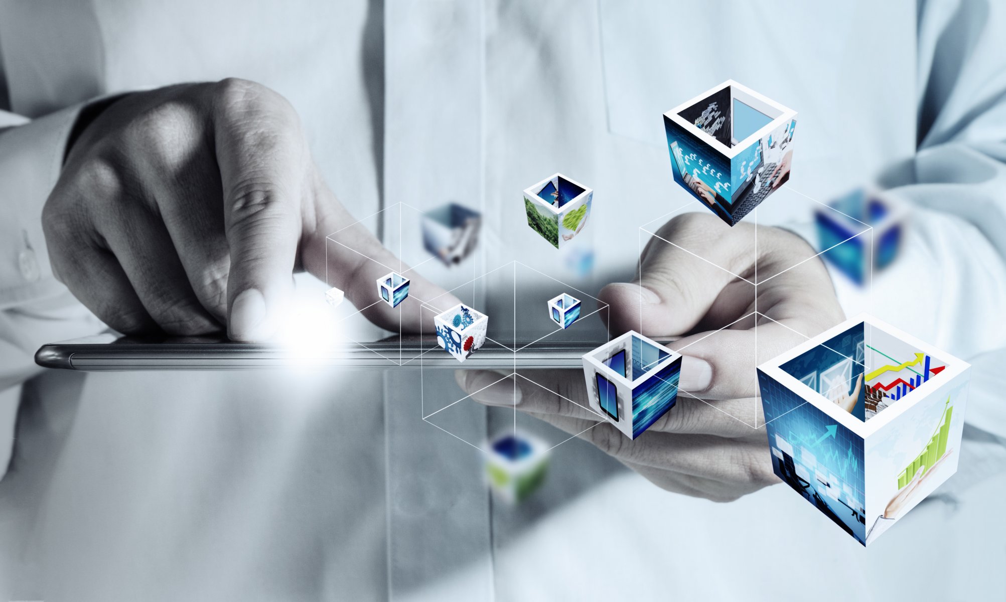 Proiezione della sfera senza peso della tecnologia nelle mani dell'uomo