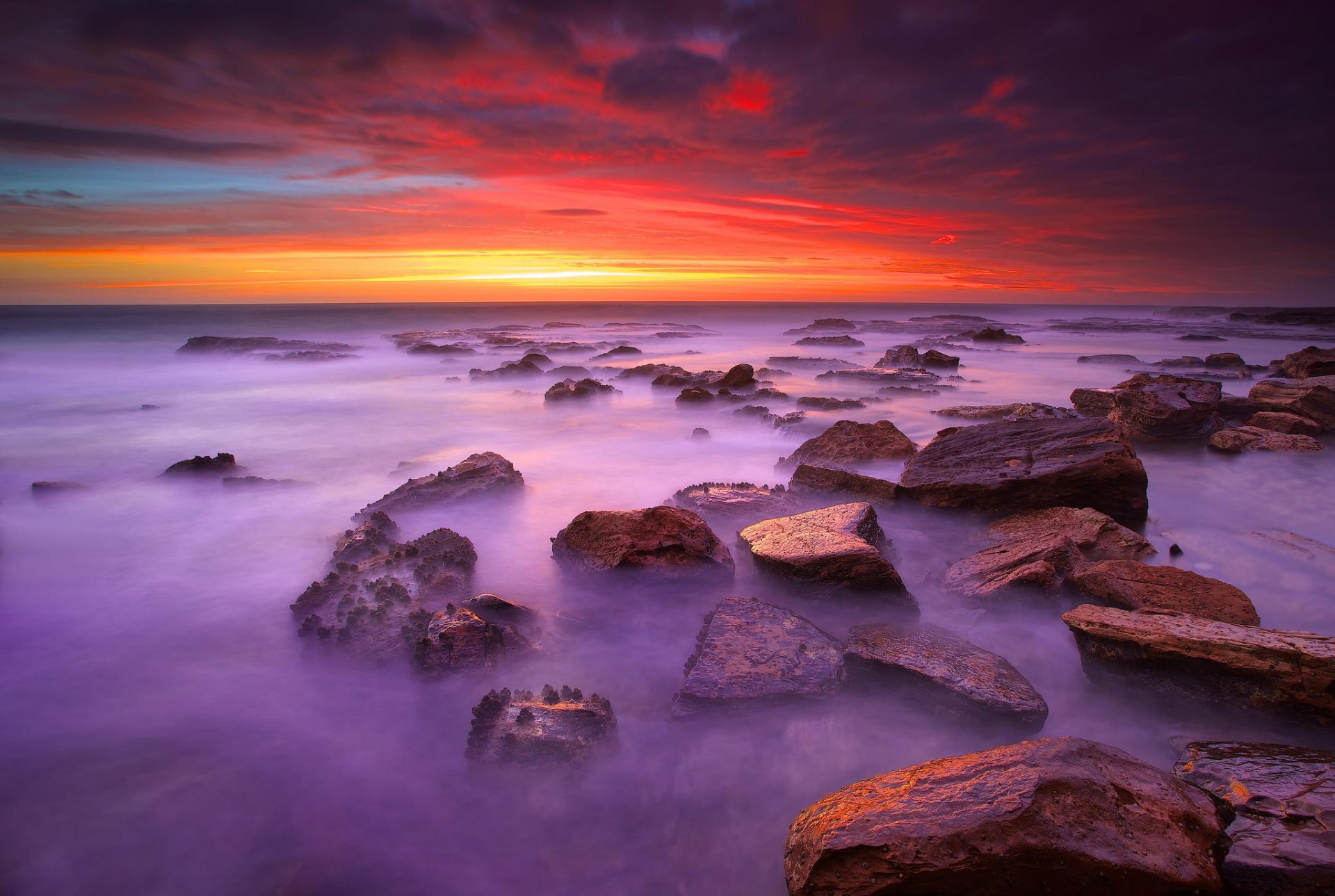 Alba sulla spiaggia dell'oceano della Nuova Zelanda. Pietre tra le onde
