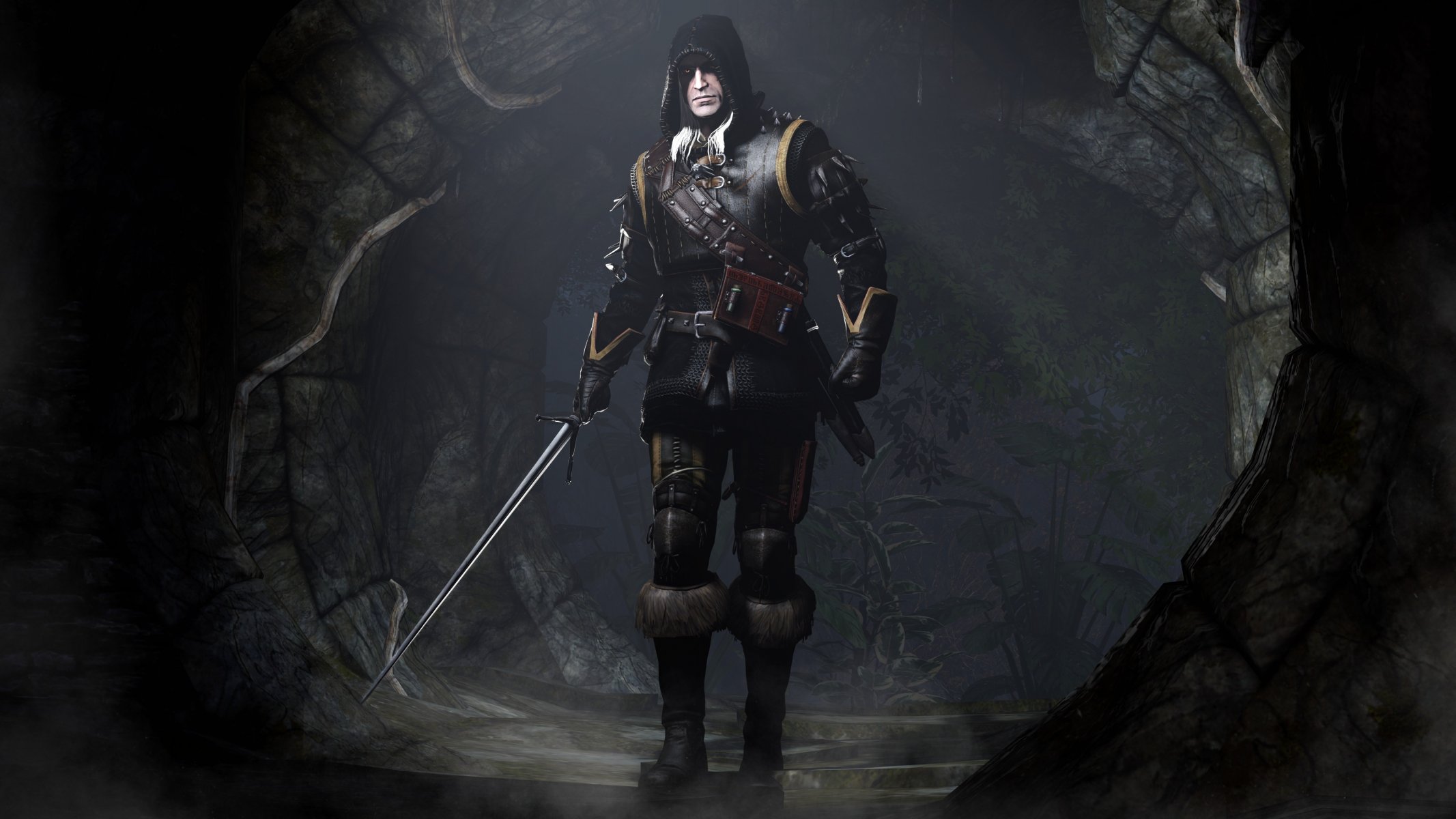 Guerriero in armatura e con una spada in una grotta