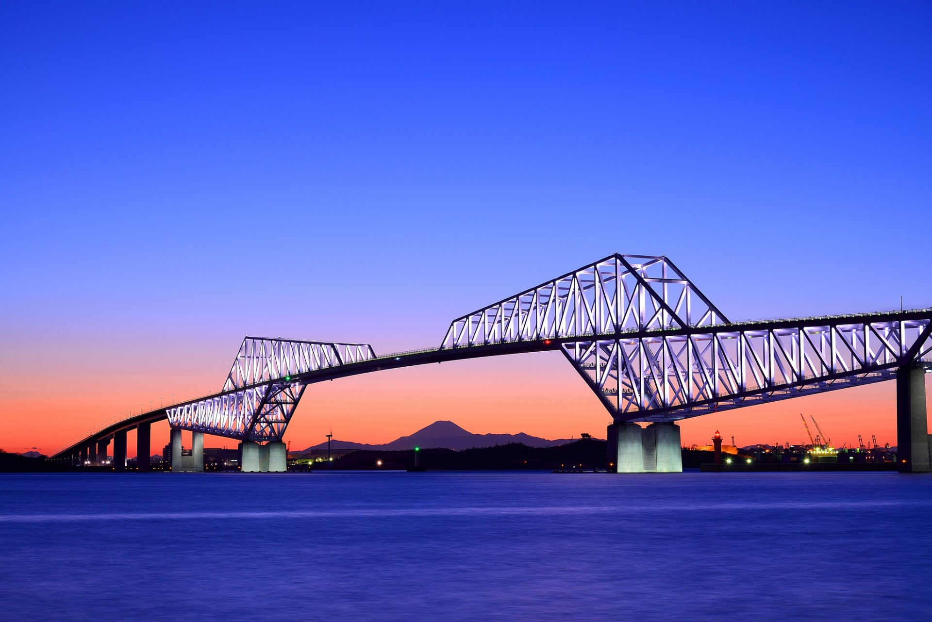 Metropoli capitale ponte fiume grattacieli, edifici, sera