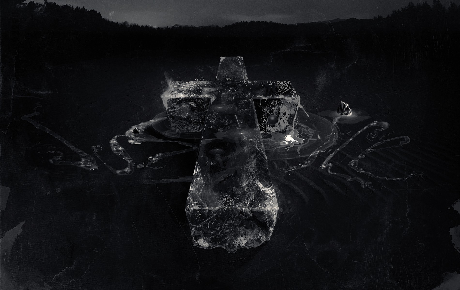 Croce in bianco e nero realizzata come se fosse di granito su uno sfondo scuro e leggermente illuminata