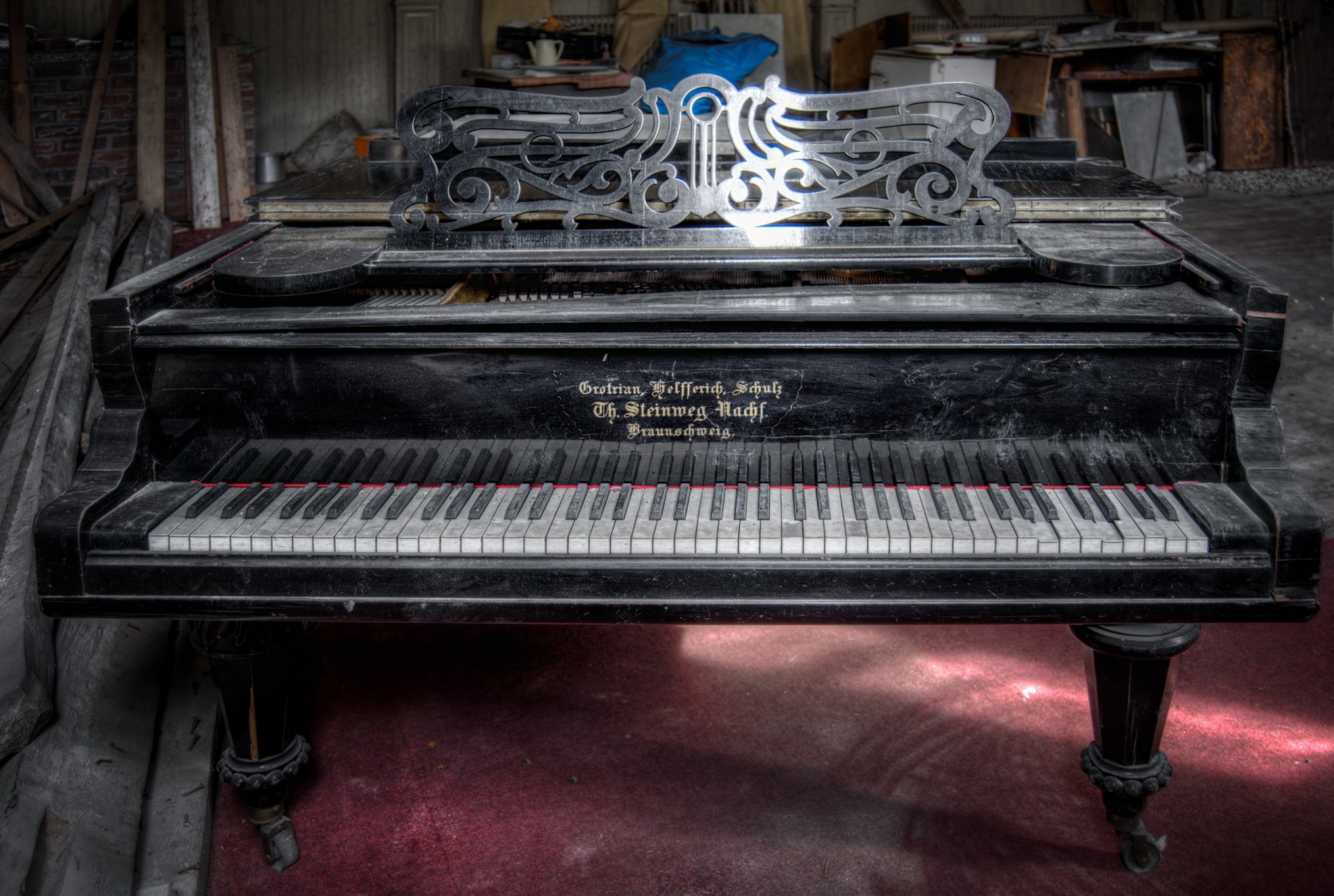 Pianoforte polveroso sul pavimento rosso