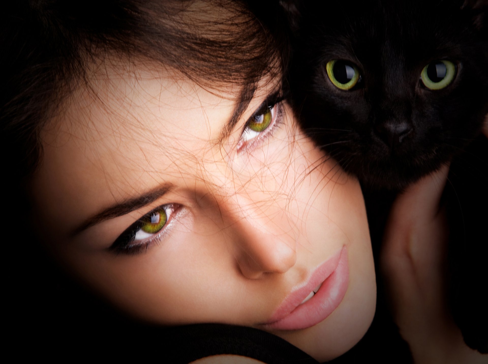 Ragazza dagli occhi verdi con gatto nero dagli occhi verdi