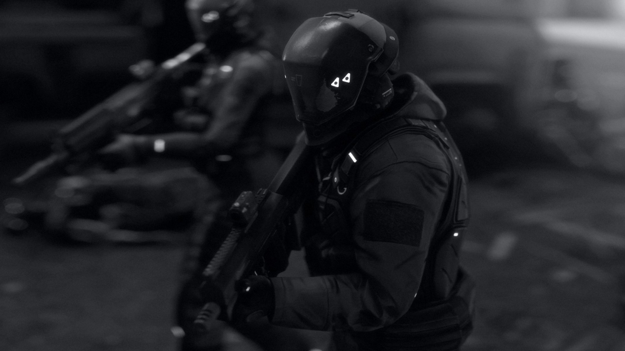 Mercenario che indossa un giubbotto antiproiettile con una mitragliatrice. Uomo in casco