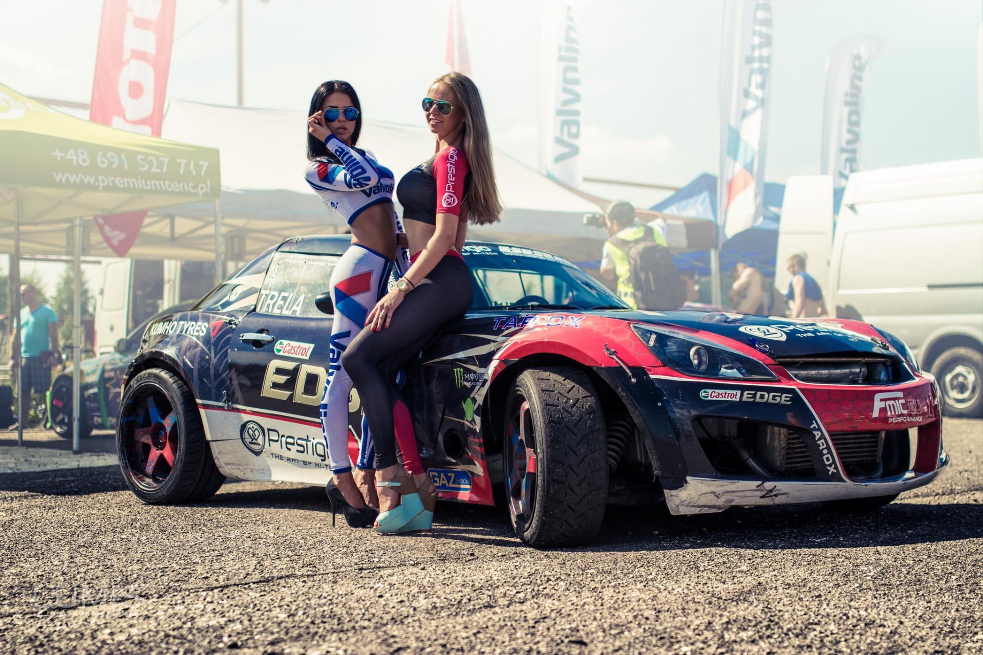 Una nissan sportiva blu sotto il sole cocente e le palme