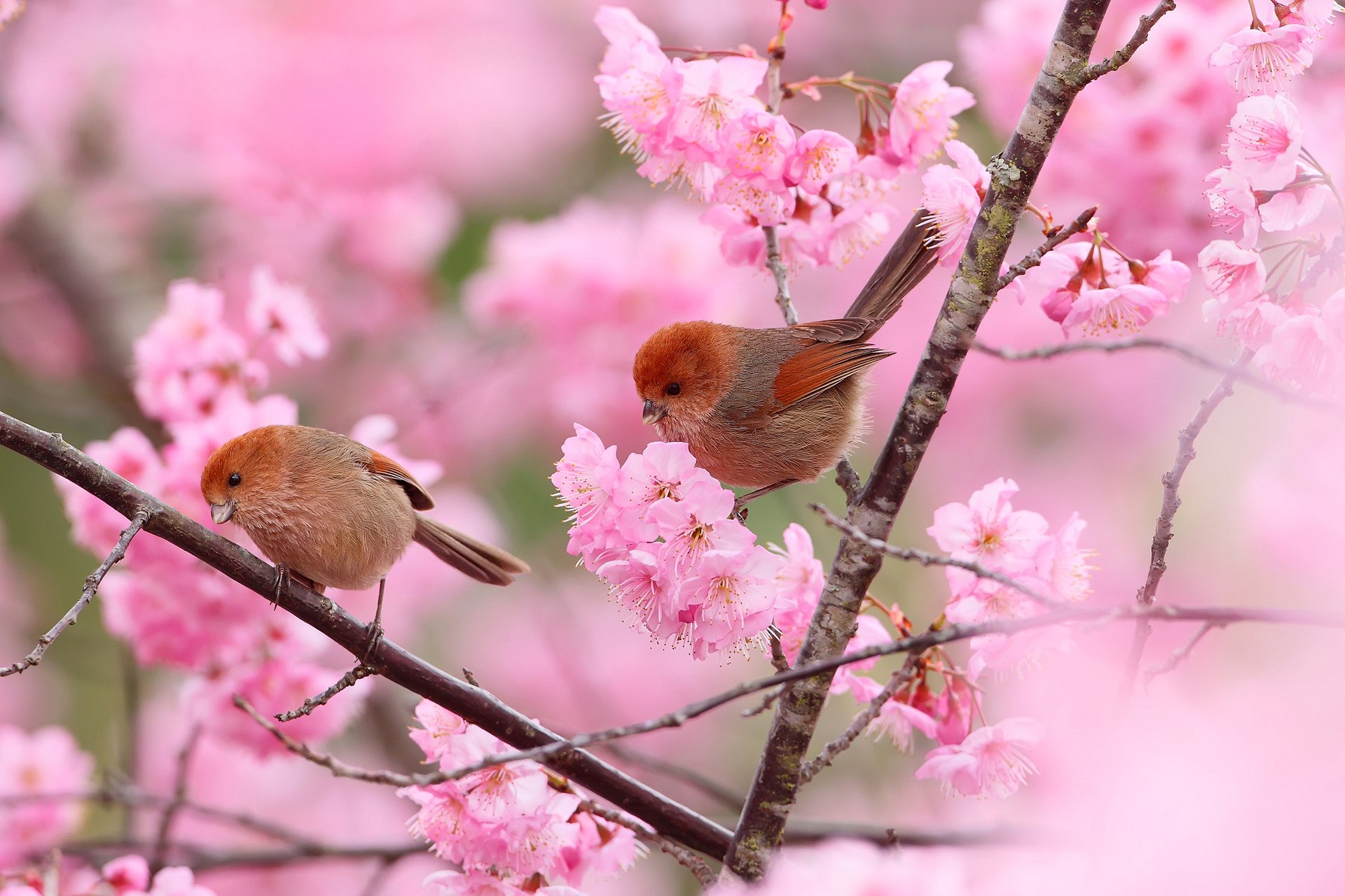 Giardino primaverile con due uccelli
