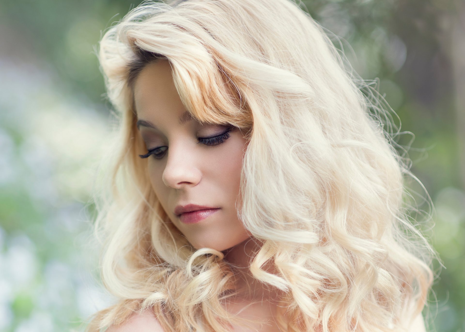 Ritratto di una bella bionda con uno sguardo verso il basso