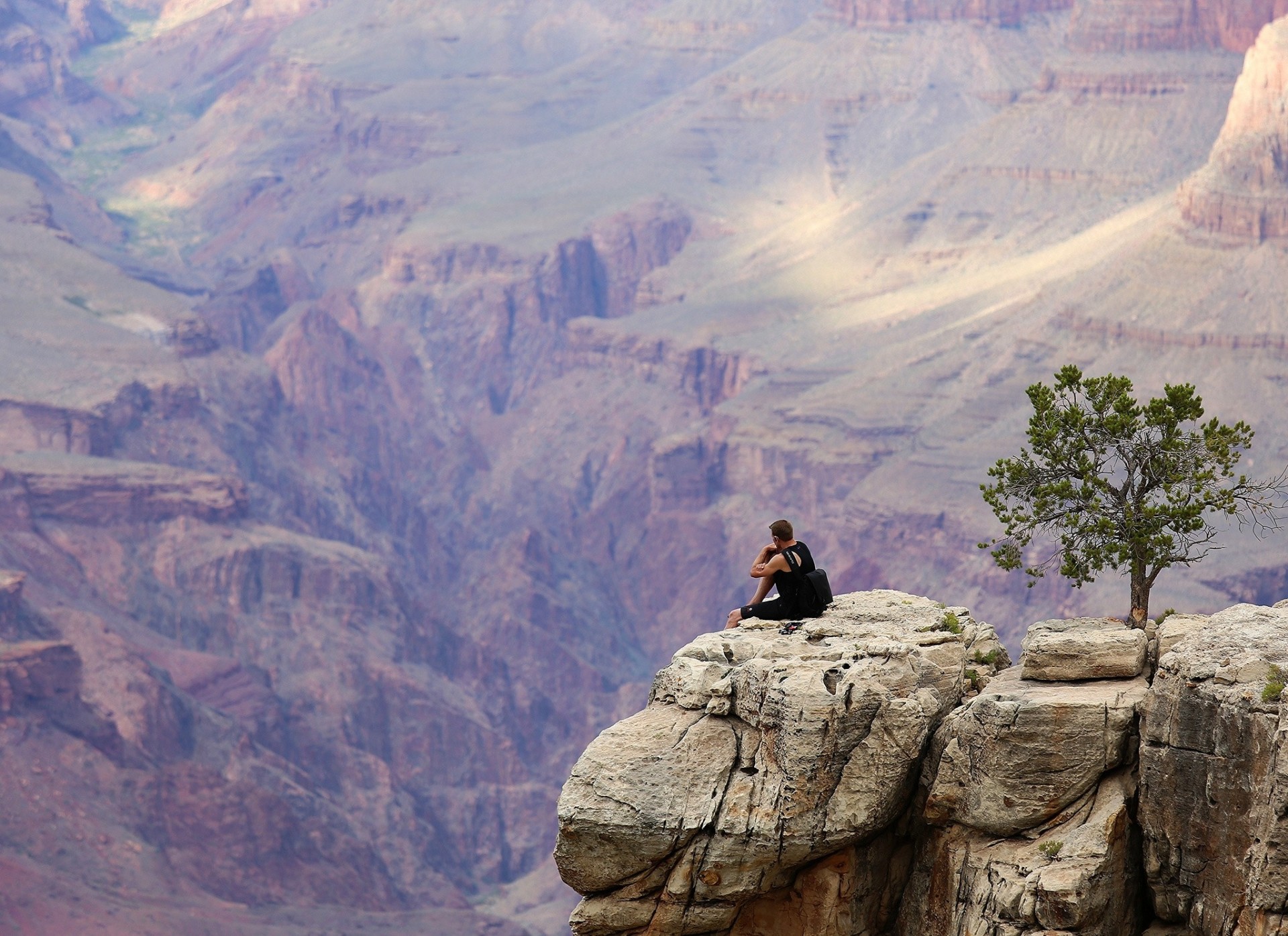L'uomo si siede su una scogliera in una bella canienne