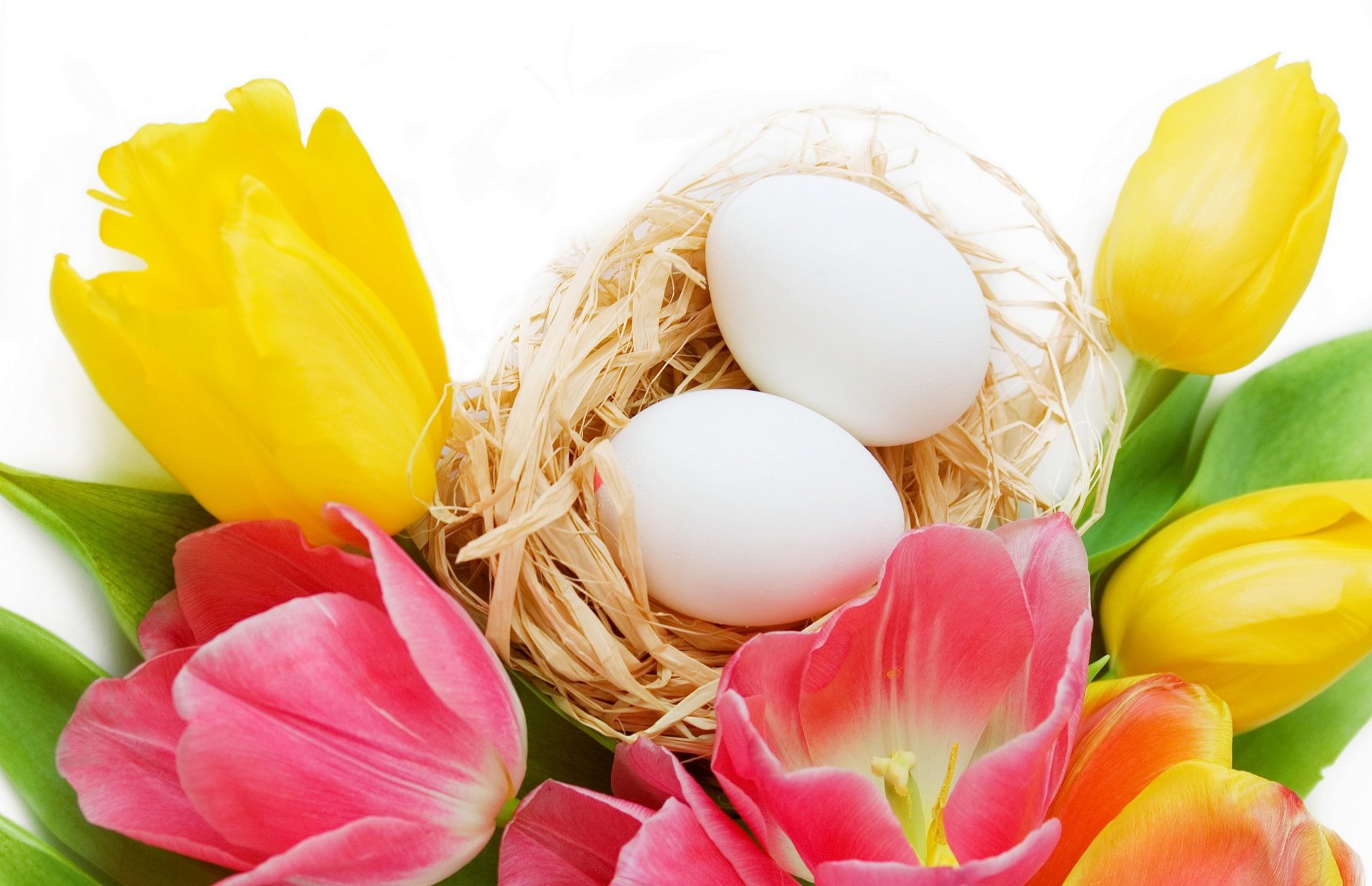 Natura morta di Pasqua con dolci pasquali, uova colorate e salice