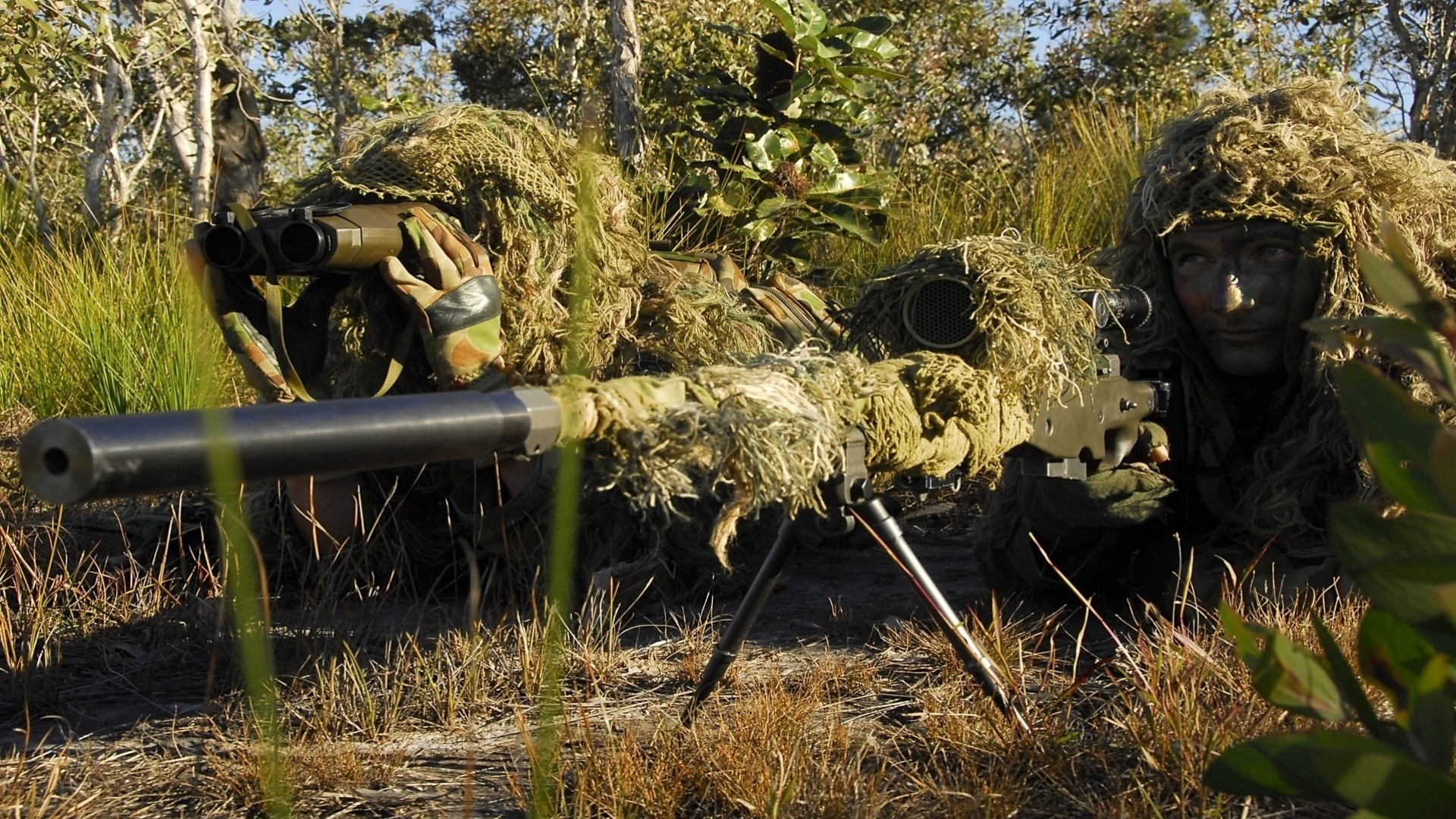 Un militare in agguato guarda nel mirino ottico della sua arma