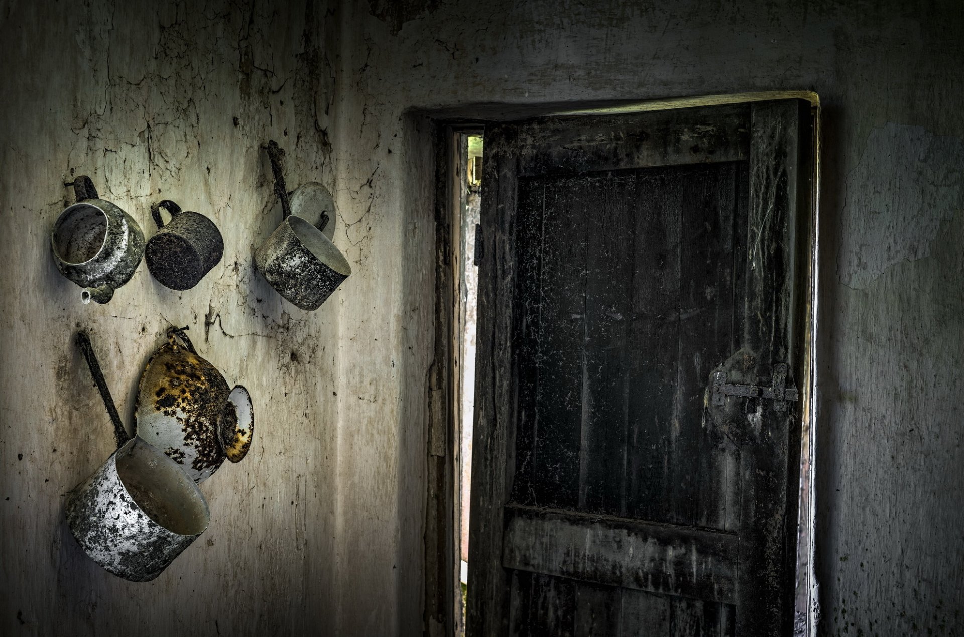 Vecchia porta in una stanza con piatti sporchi sul muro