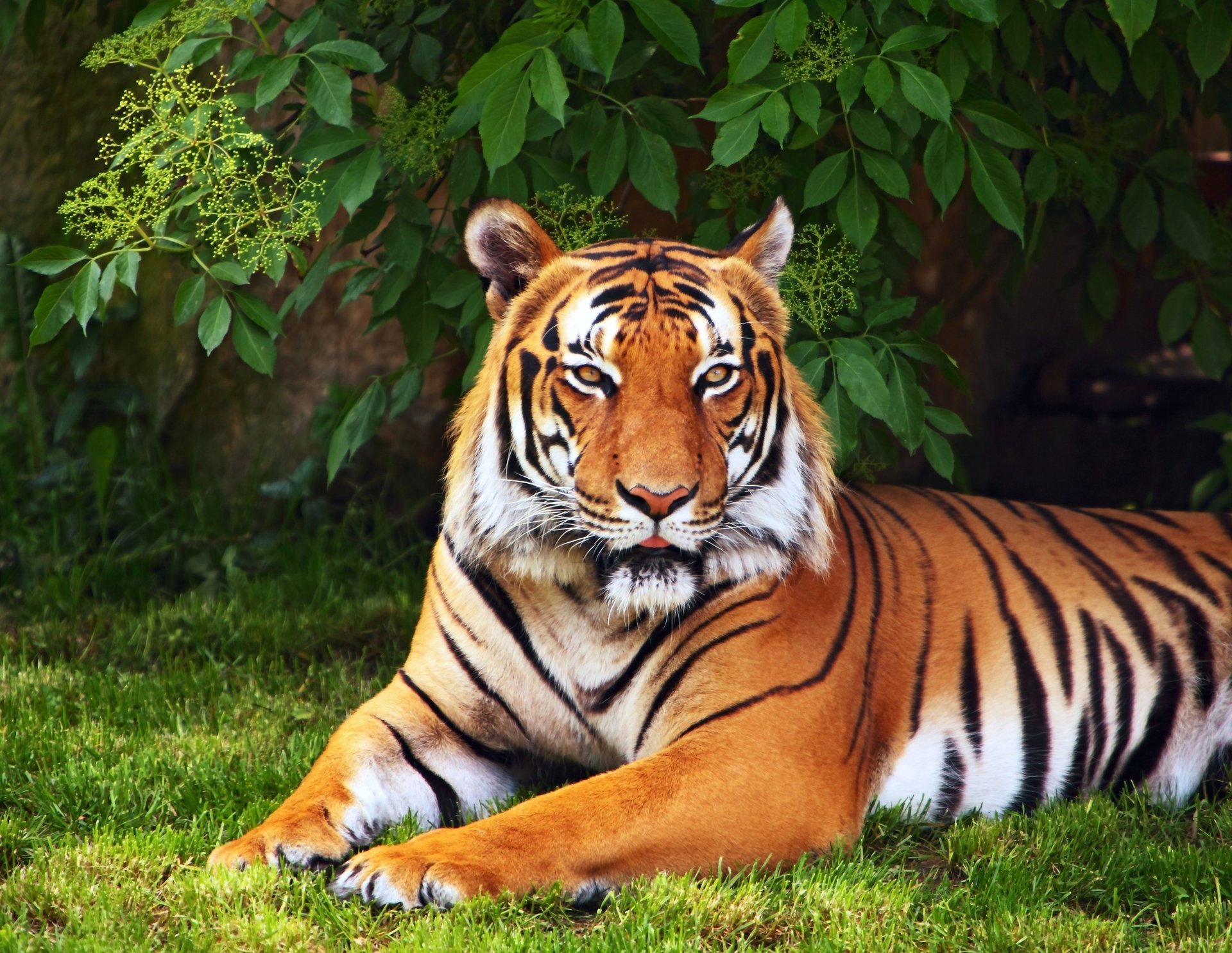 Una tigre formidabile riposa tra una fitta vegetazione verde