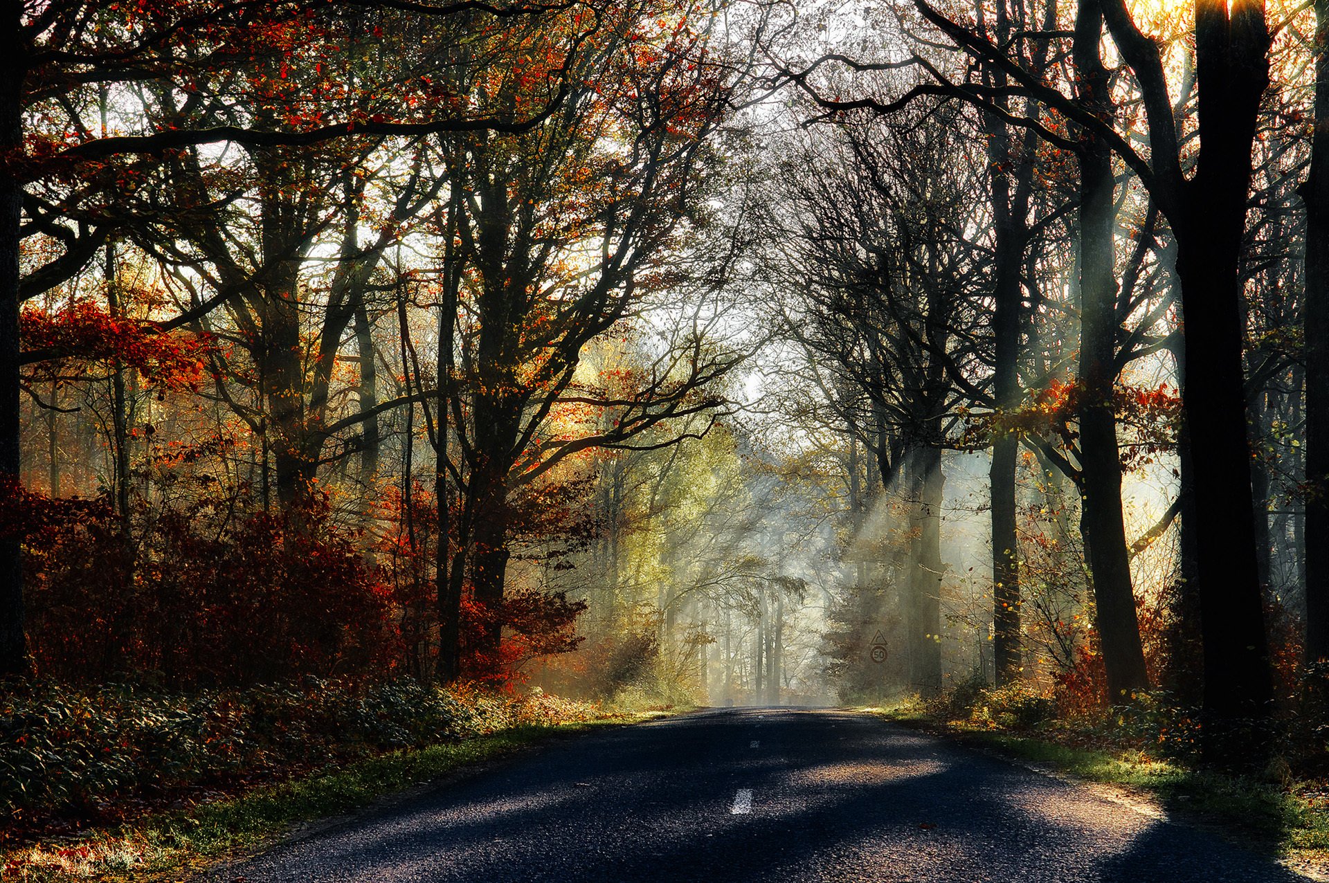 La strada all'alba nella foresta ancora addormentata
