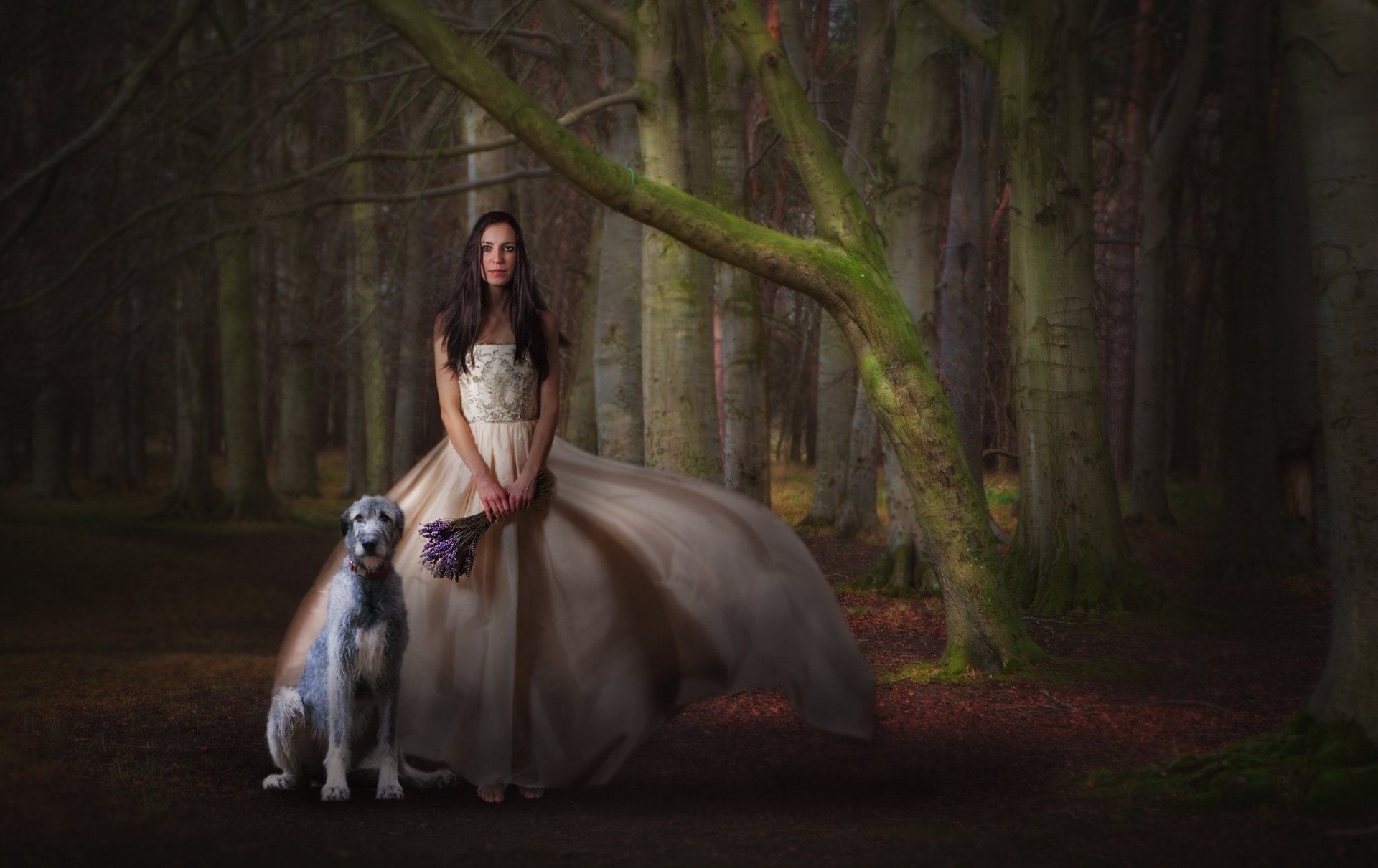 Ragazza in un bel vestito con un mazzo di fiori e un cagnolino
