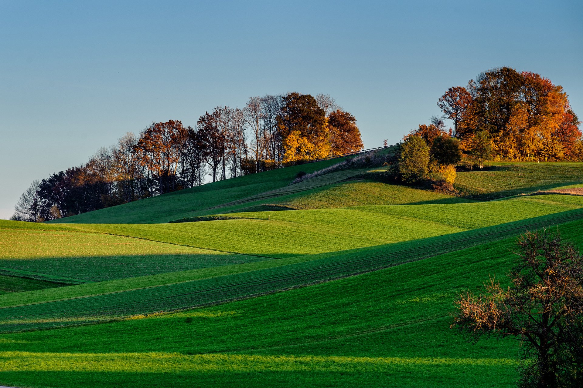 Prati erbosi verde brillante. Giorno d'estate. Foresta all'orizzonte