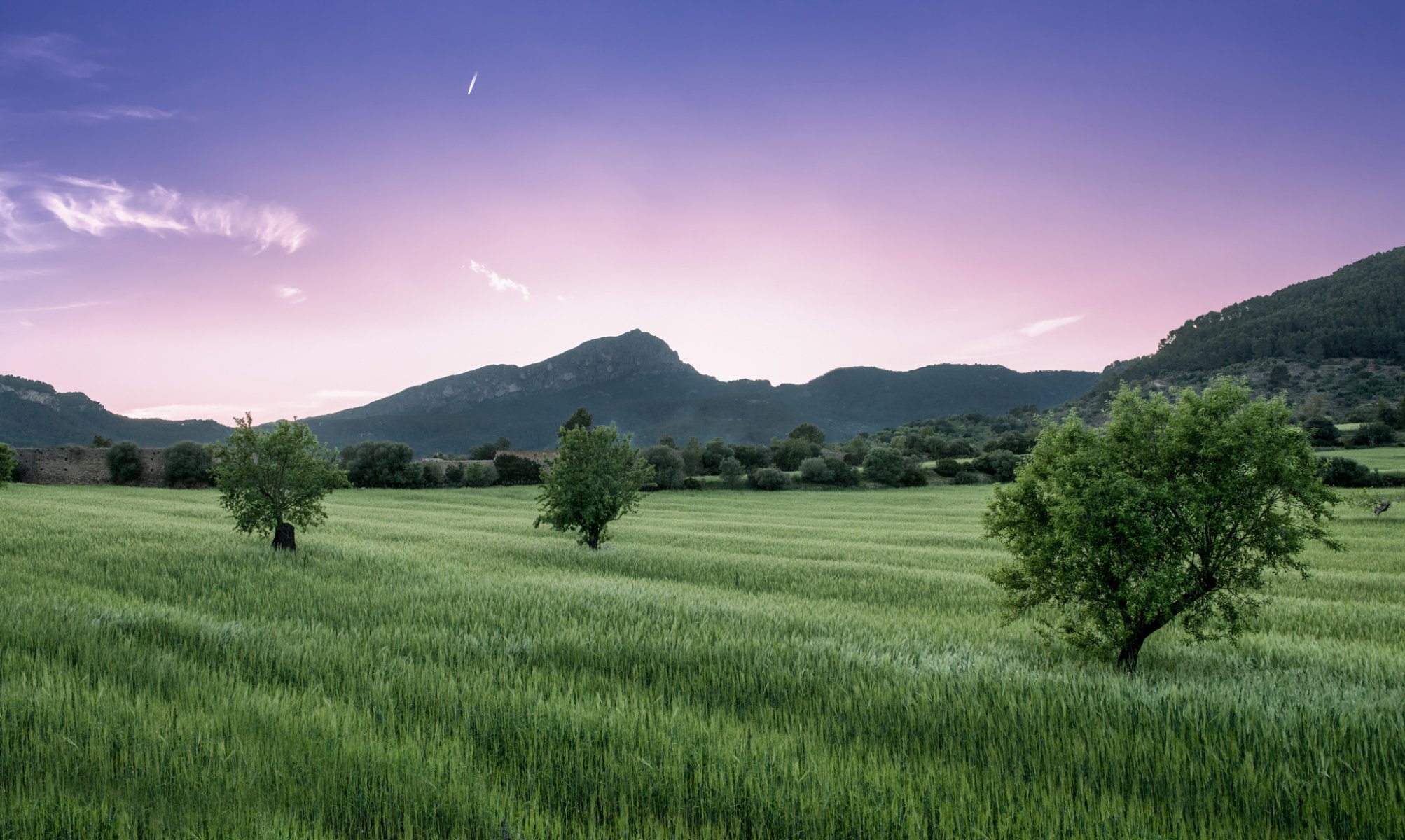 Campo verde su sfondo di montagna e cielo viola