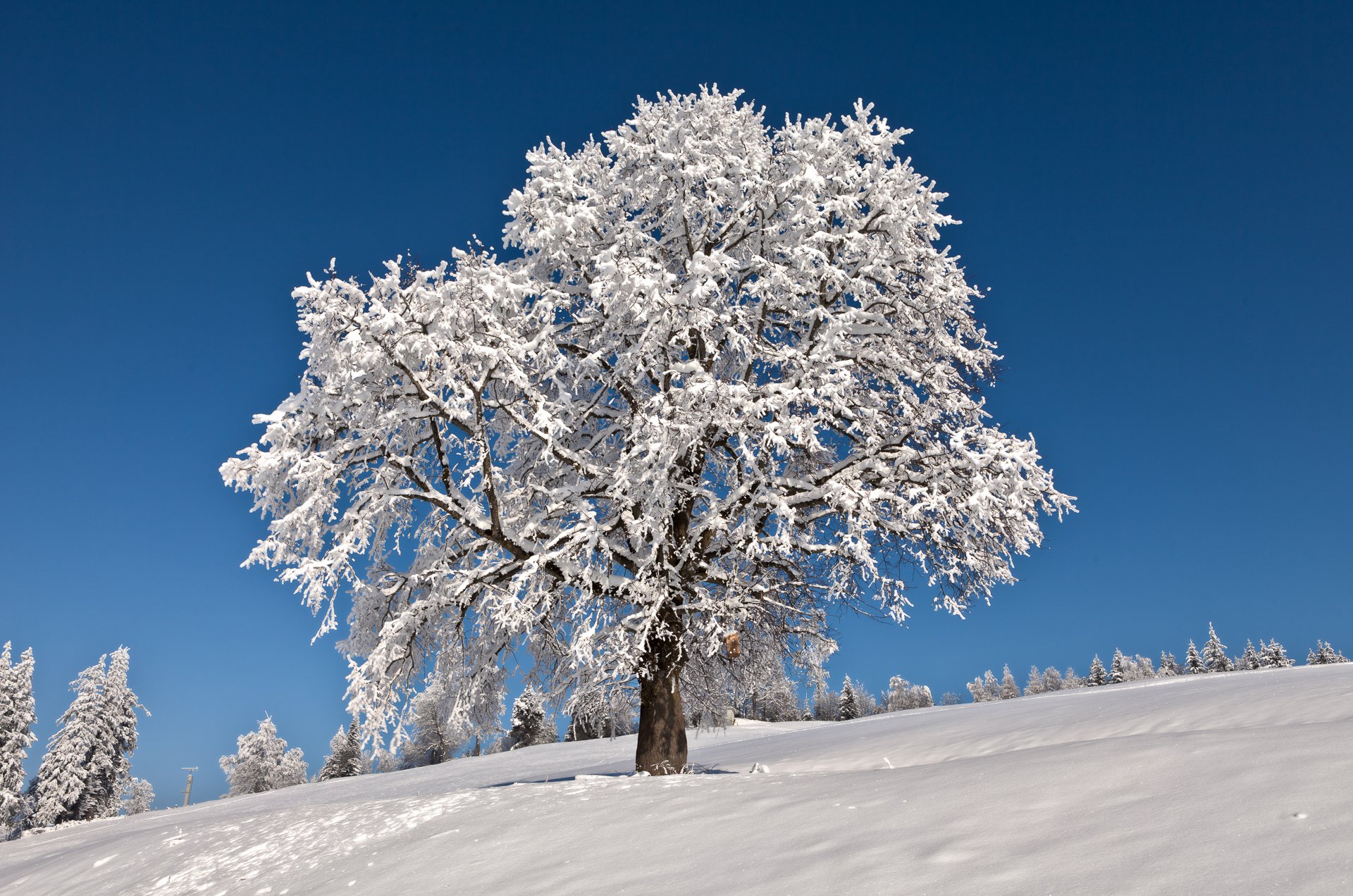 Cime di alberi di pino in brina su uno sfondo di cielo bluCime di alberi di pino in brina su uno sfondo di cielo blu