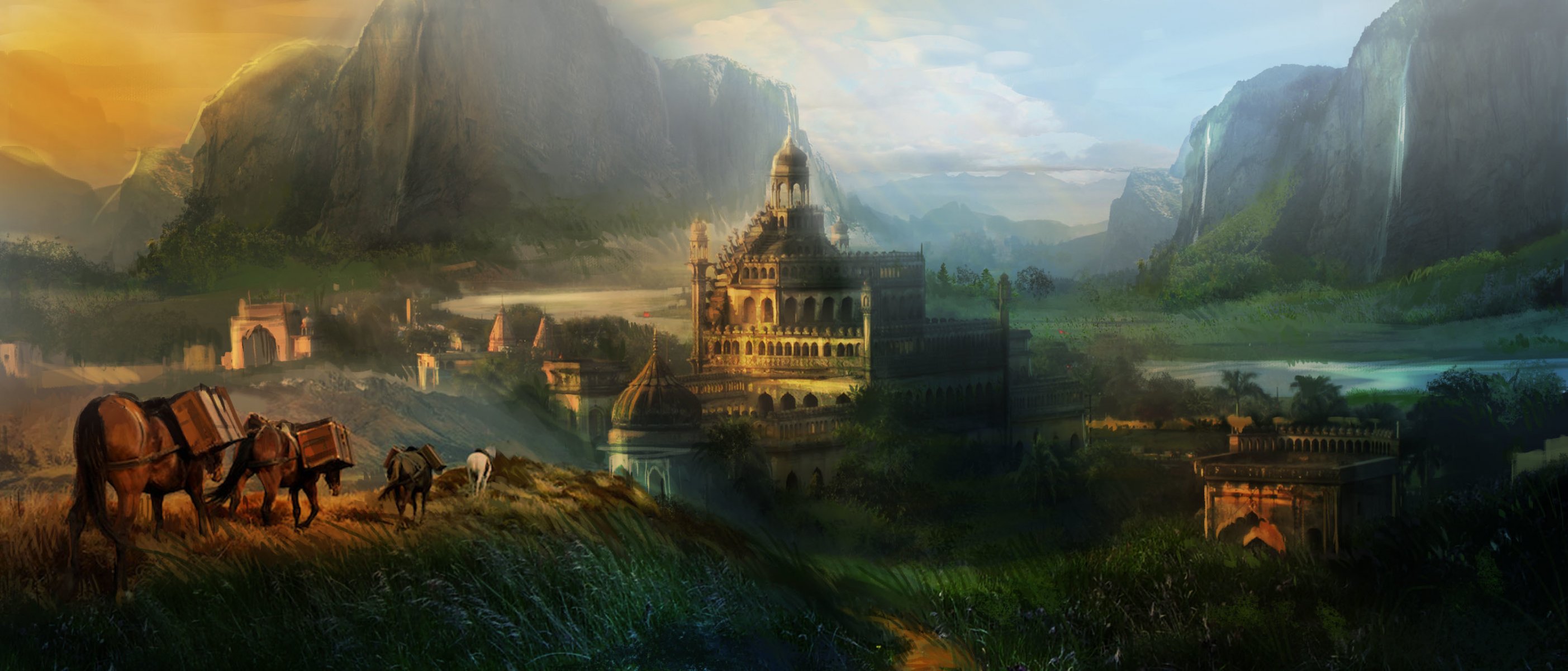 Carovana di cavalli sullo sfondo di montagne e cascateCarovana di cavalli sullo sfondo di montagne e cascate