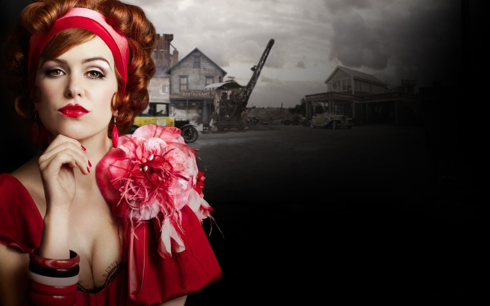 Bella signora in rosso e scollatura sullo sfondo del villaggioBella signora in rosso e scollatura sullo sfondo del villaggio