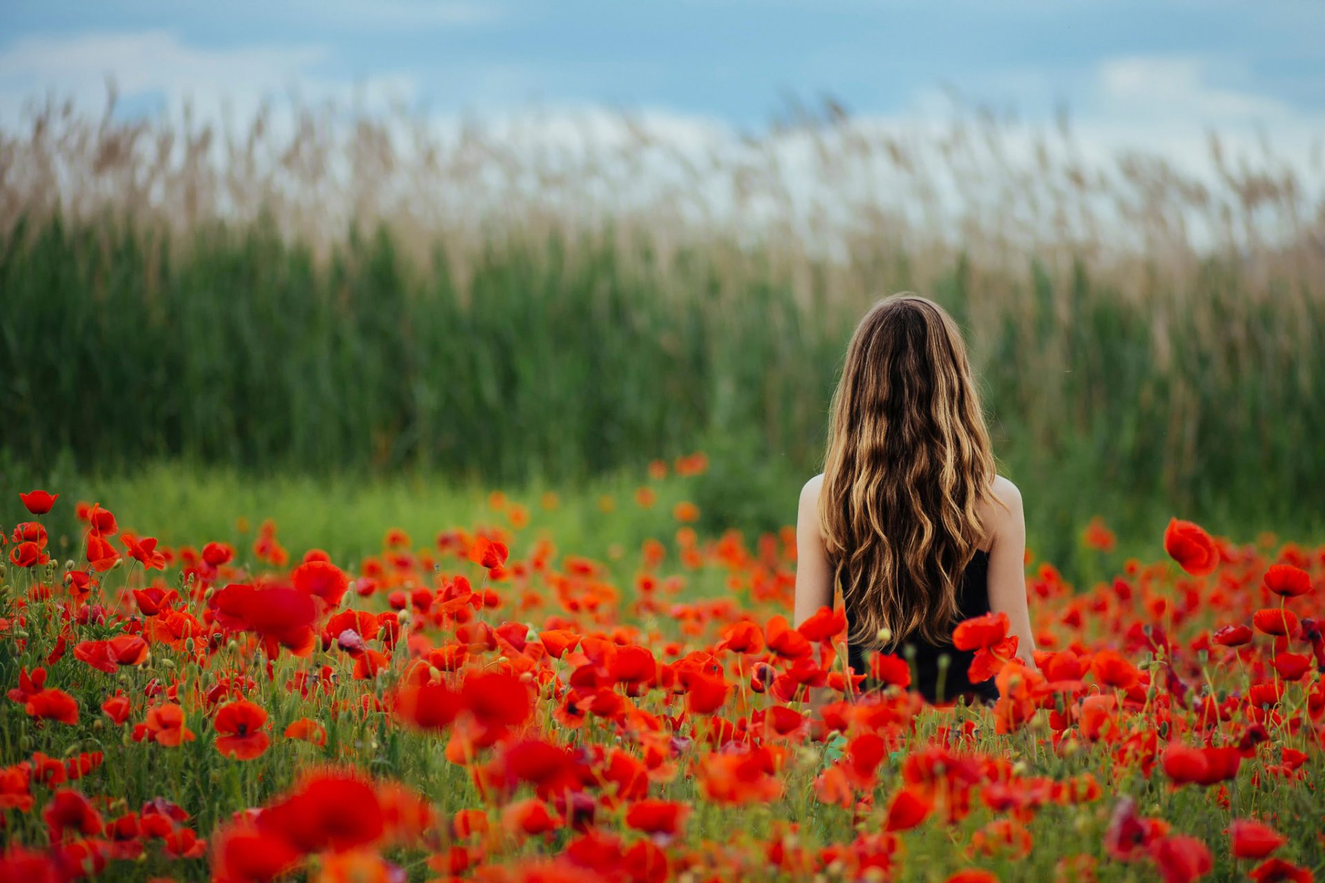 Ragazza sullo sfondo di un campo di papavero rosso nei fiori